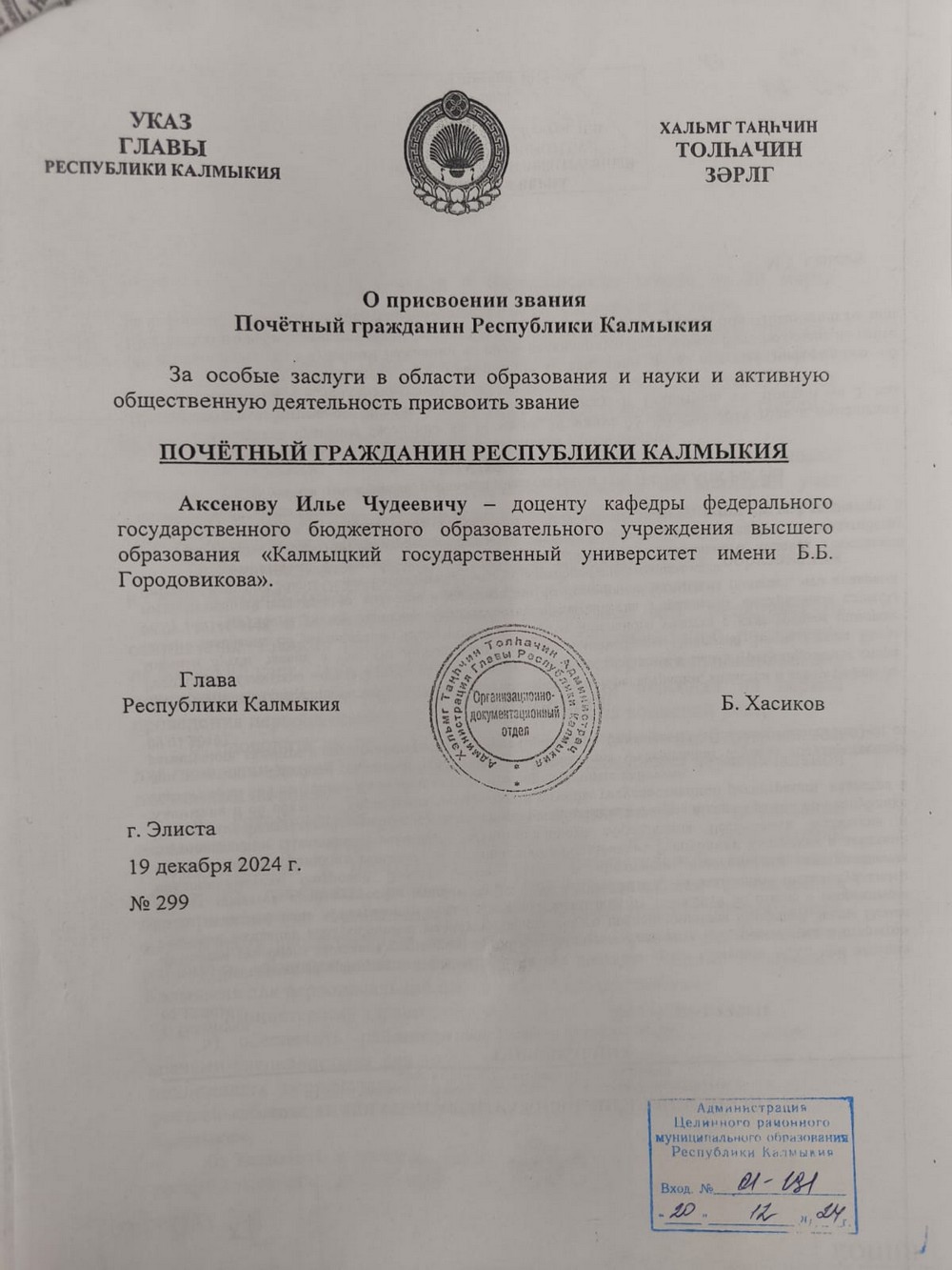 За особые заслуги в области образования и науки и активную общественную деятельность Указом № 299 от 19 декабря 2024 г. Глава Республики Калмыкия Бату Хасиков присвоил звание «Почетный гражданин Республики Калмыкия» доценту Кафедры теории и истории государства и права КалмГУ, Заслуженному юристу Российской Федерации Илье Чудеевичу Аксенову.