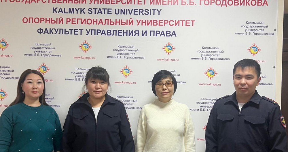 В мероприятии приняли участие декан факультета управления и права Виктория Ромадикова, зав. кафедрой уголовного права и процесса Деля Ольдеева, заместитель начальника Управления по работе с личным составом МВД по РК, подполковник полиции Людмила Мангутова, а также старший инспектор отдела профессиональной подготовки Управления по работе с личным составом МВД по РК, старший лейтенант полиции Дорджи Манджиев.