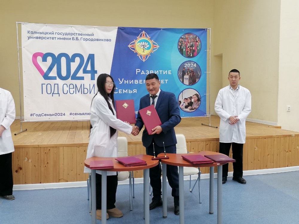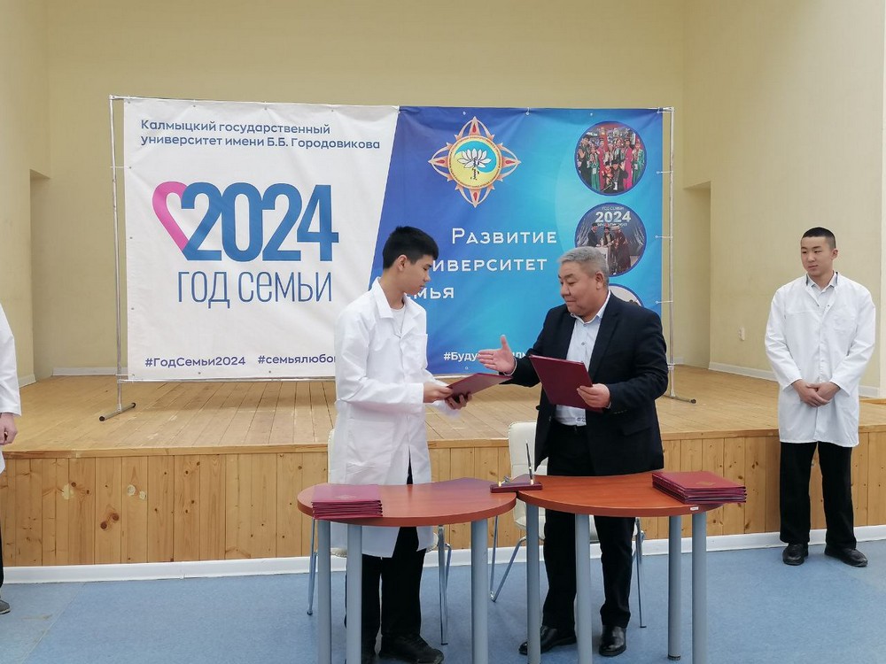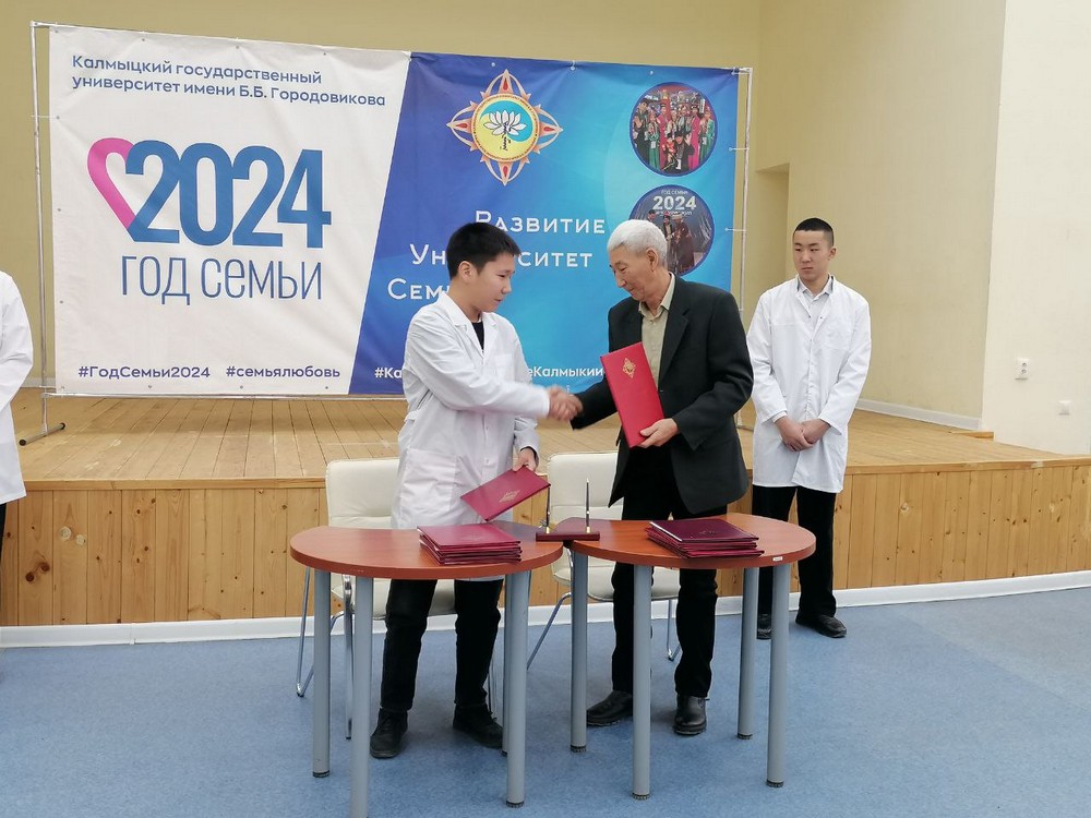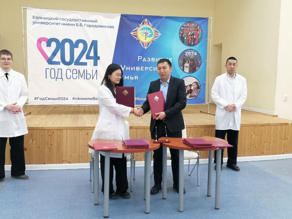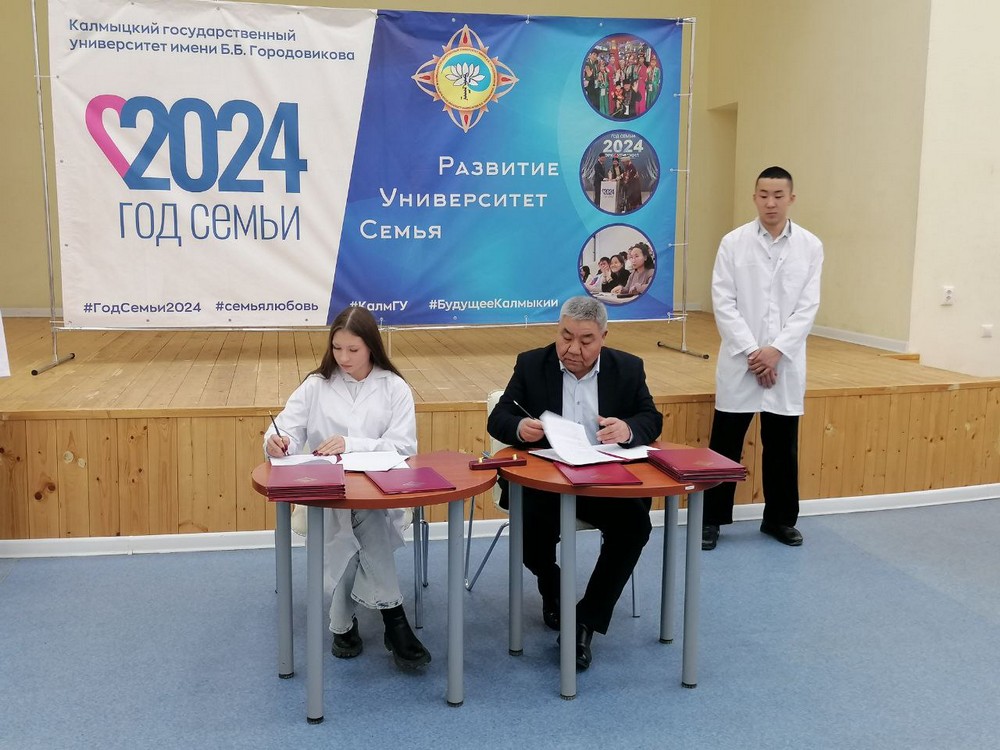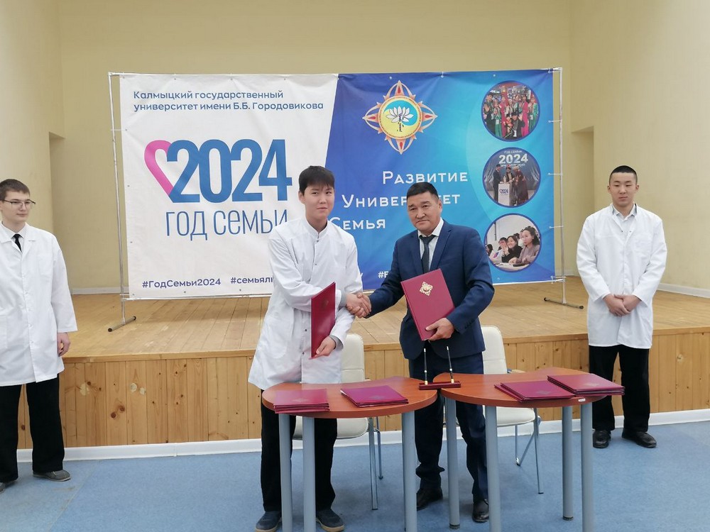 Сегодня состоялась торжественная церемония подписания договоров о целевом обучении по программам среднего профессионального образования КалмГУ с Управлением ветеринарии Республики Калмыкия. В мероприятии приняли участие ректор университета Бадма Салаев, и.о. начальника Управления ветеринарии Виктор Санджиев, руководители Республиканской ветеринарной лаборатории и станций по борьбе с болезнями животных (Юстинская, Черноземельская, Целинная, Приютненская, Лаганская, Яшалтинская), директор Колледжа профессионального образования Байрта Арашаева и студенты 1 курса направления «Ветеринария».