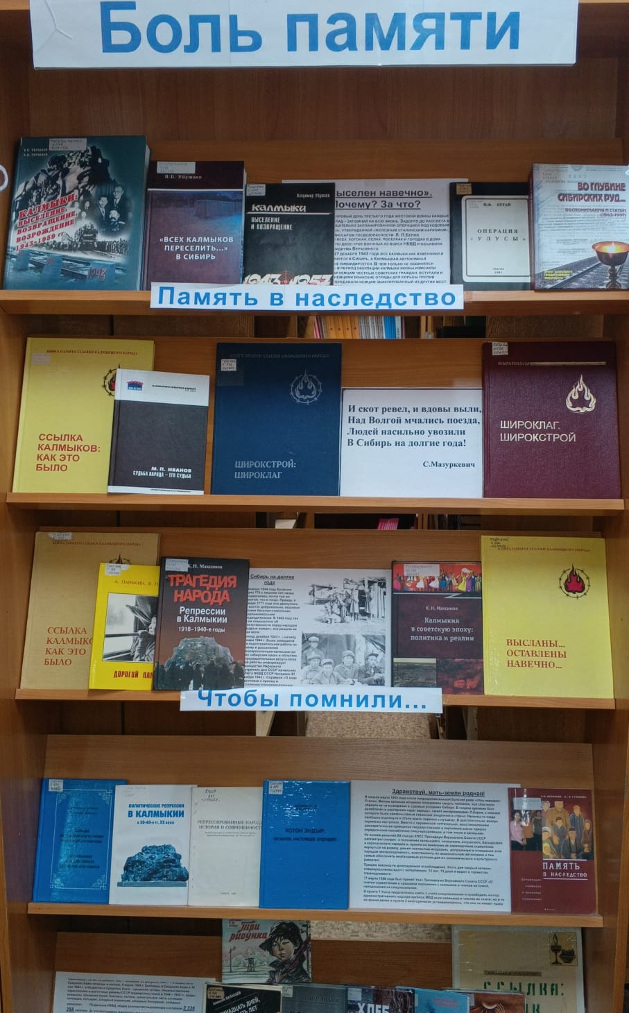 Сотрудники библиотеки педагогического факультета подготовили книжную выставку «Боль памяти», где были представлены монографии, сборники научных трудов, материалы конференций, художественные произведения о депортации калмыцкого народа.
