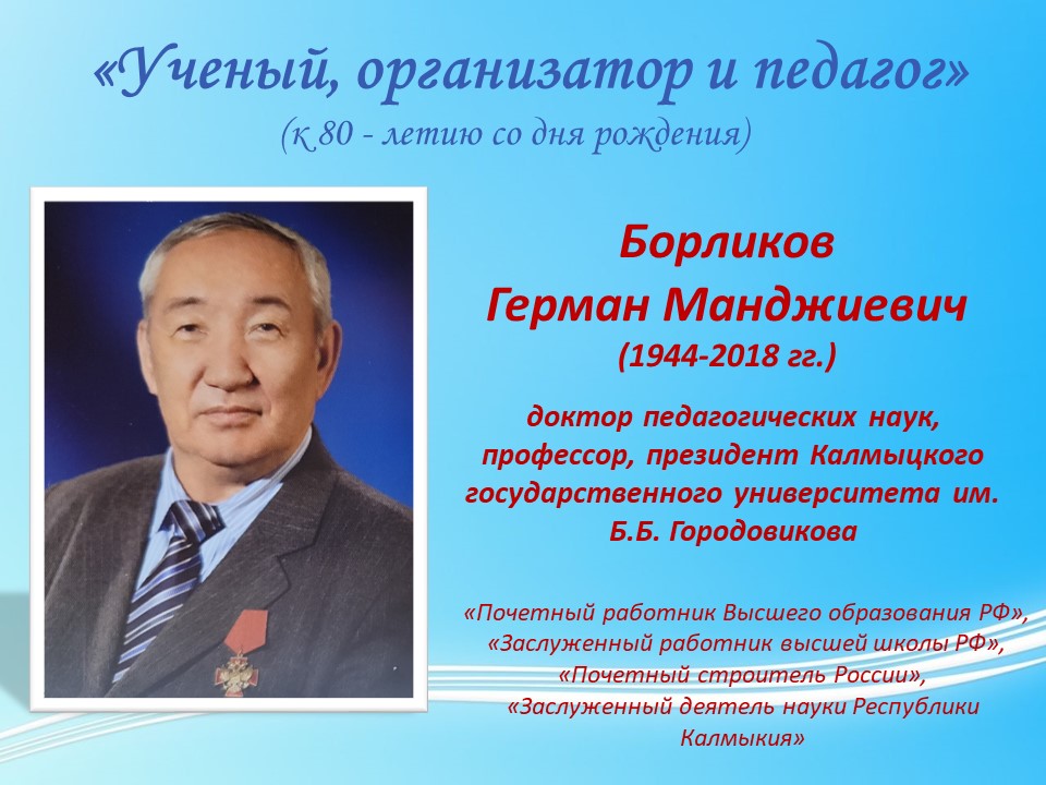 Кстати, несмотря на большую занятость административной работой, Герман Манджиевич продолжал и преподавательскую деятельность, его научные работы до сих пор не теряют актуальности. Подтверждением этому, пожалуй, можно назвать Национальную научную конференцию «Комплексная безопасность регионов», которая посвящена его 80-летию и начинается в университете сегодня, 20 декабря, в день его рождения. Сотрудниками научной библиотеки, неизменной участницы всех научных и воспитательных мероприятий университета, подготовлена книжная выставка «Герман Борликов — ступени жизни». На ней представлены статьи, монографии, учебные пособия, подготовленные им самим и в соавторстве с другими учеными по самому широкому кругу вопросов, издания трех инициированных им серий, речь о них шла выше, книги о самом Германе Манджиевиче. Он пользовался заслуженным уважением и авторитетом не только в нашей республике, но и за ее пределами. Это послужило тому, что его имя включено в ряд российских изданий: в энциклопедию «Кто есть кто», объединяющую сведения о тех, кто движет прогресс в различных сферах жизни общества, в фотоальбом «Южный Федеральный. Первые лица — формула успеха». Имя Германа Манджиевича значится и в международной серии энциклопедии «Кто есть кто».