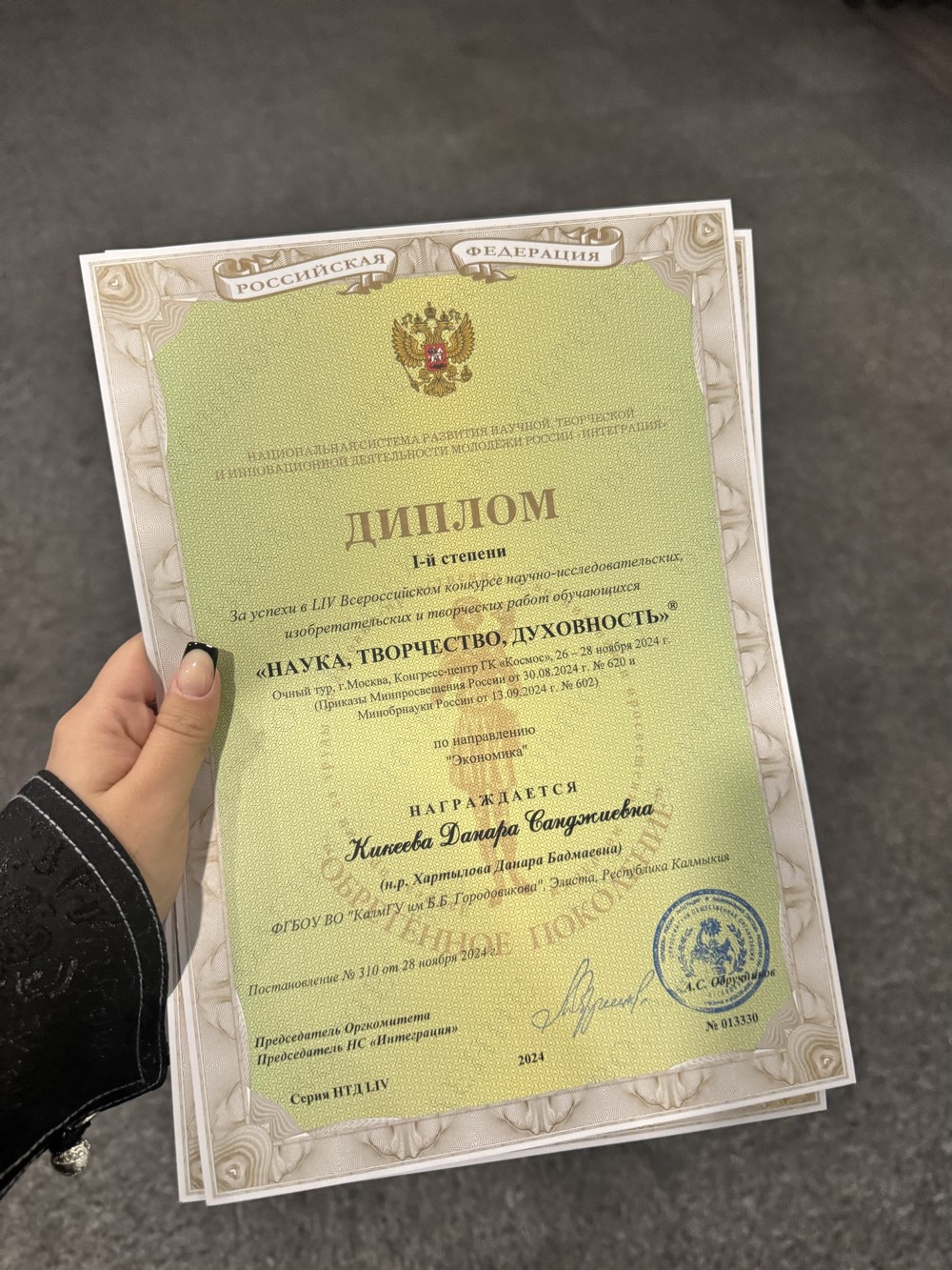 По итогам представления своей научной работы Кикеева награждена дипломом I степени (научный руководитель – к.э.н., доцент кафедры экономики и управления на предприятии Данара Хартылова).