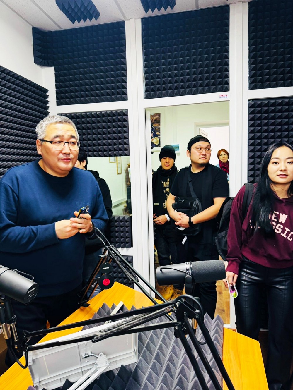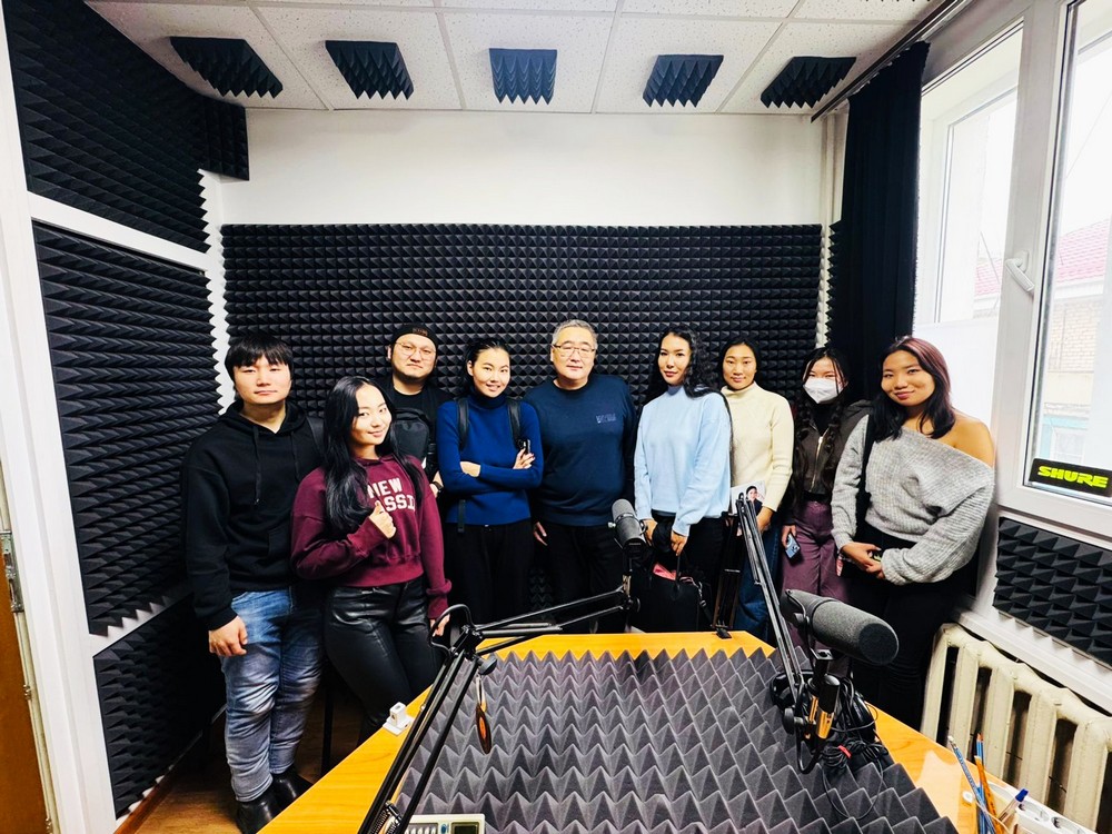 После этого монгольские студенты посетили редакцию творческих проектов, где познакомились с главным редактором Ю.Ю. Цакировым. Он кратко рассказал о специфике своей работы и провел стажеров в редакцию телевидения и радиовещания. Здесь звукорежиссер Э.В. Манджиев продемонстрировал радиостудию, где ведется запись программ и их монтаж.