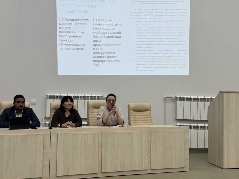 18 и 19 декабря в стенах Калмыцкого государственного университета состоялись встречи с иностранными студентами из Ближнего и Дальнего Зарубежья. Основными темами обсуждения стали успеваемость и посещаемость занятий, а также соблюдение миграционного законодательства, что особенно актуально для иностранных обучающихся.