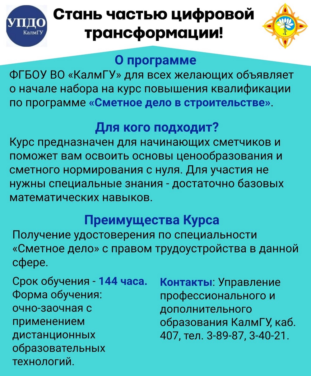 КалмГУ объявляет о начале набора на курс «Сметное дело в строительстве»