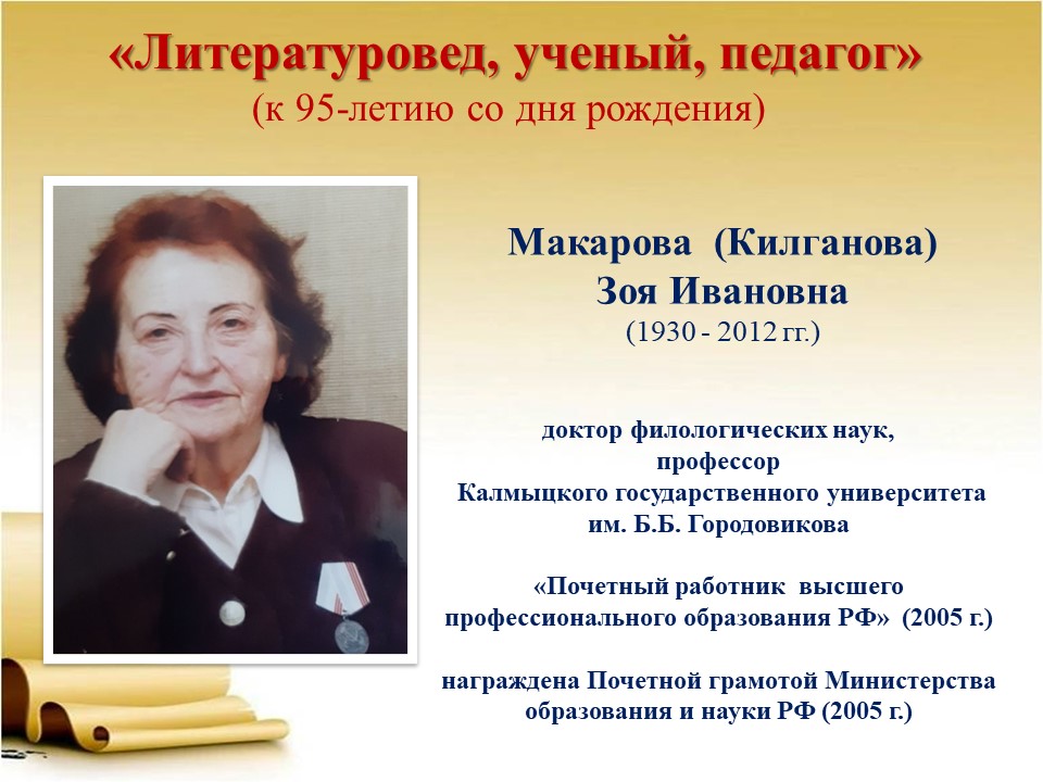 Зоя Ивановна Макарова (Килганова) – доктор филологических наук, профессор, исследователь русской и калмыцкой литературы. Ее имя навсегда вписано в летопись...