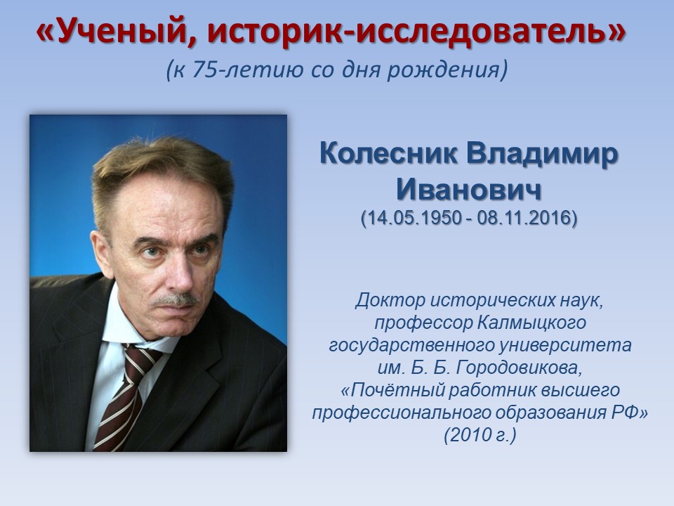 14 мая 2025 года исполнилось бы 75 лет со дня рождения доктора исторических наук, профессора кафедры всеобщей истории и регионоведения КалмГУ Колесника...