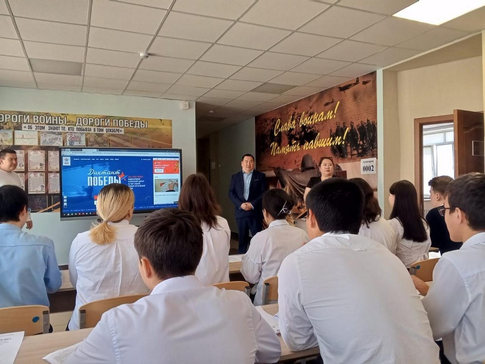 На площадке медицинского факультета КалмГУ в «Диктанте Победы» приняли участие зам. декана аграрного факультета по воспитательной работе Саглара Убушаева, ст. преподаватель Максим Евчук и студенты направления «Агрономия» и специальности «Ветеринария».