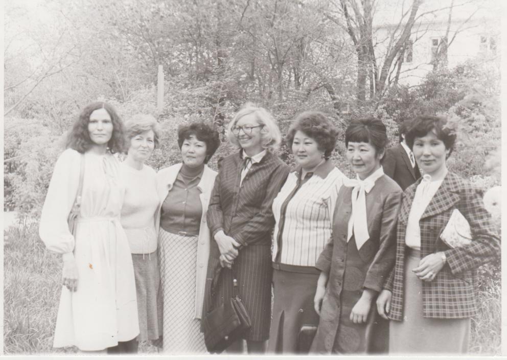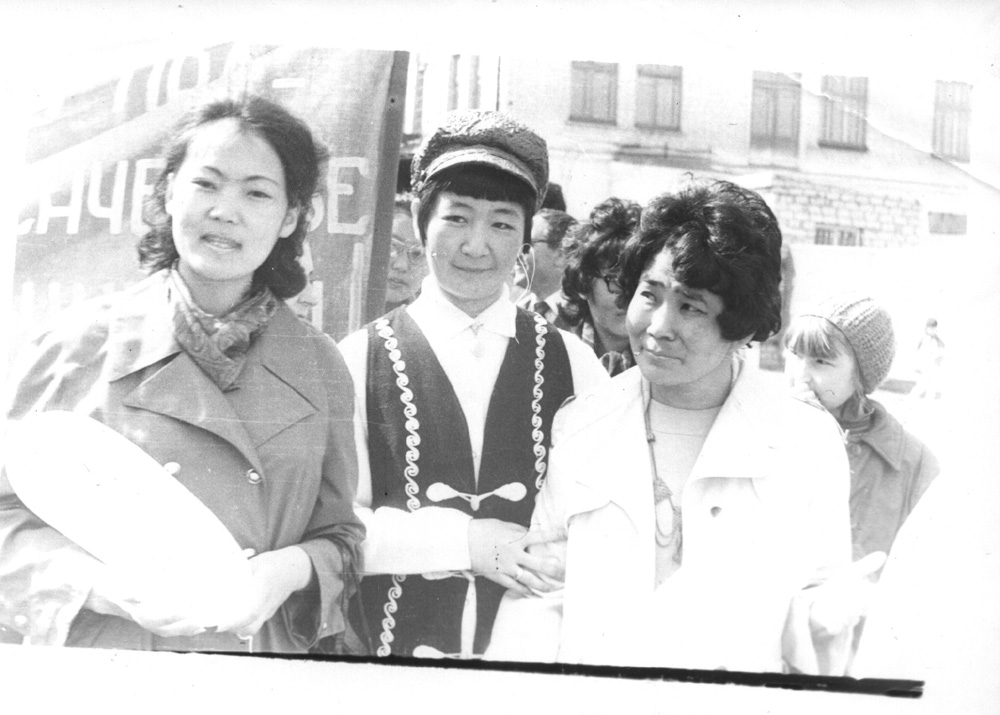 Фото 3. Преподаватели кафедры иностранных языков после майской демонстрации, 1981 г. Слева направо: Прокопенко (Разбегина) Анна Ивановна (латинский язык), Варава Людмила Ивановна (английский язык), зав. кафедрой иностранных языков, канд. филол. наук, преп. нем. яз. И зарубежной литературы Бадмаева Нана Санджиевна, Шургинова Татьяна Ивановна (английский язык), Шанаева Людмила Бадмаевна (английский язык), Биткеева Гренада Сариевна (немецкий язык), Басанова (Максимова) Светлана Фёдоровна (английский язык)