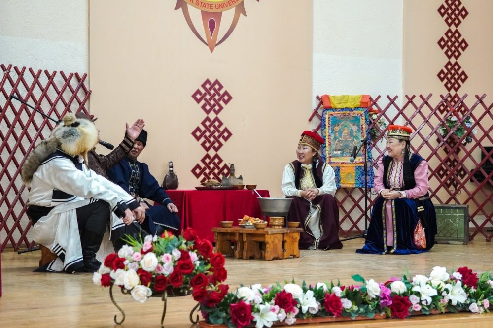 Коллектив института подготовился основательно: на сцене был инсценирован мини-спектакль о подготовке к празднику Цаган Сар с изображением традиционного быта калмыков в юрте, где участники готовят ароматный калмыцкий чай джомбу, ведут неспешный разговор.