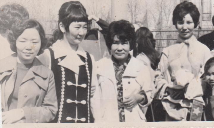Фото 2. 1 мая 1974 г. Преподаватели кафедры иностранных языков и английской филологии. Слева направо: Васильева Галина Ивановна, преподаватель немецкого языка кафедры иностранных языков, Биткеева Гренада Сариевна, преподаватель немецкого языка, Ашилова Раиса Овшиновна, преподаватель английского языка кафедры английской филологии, Максимова (Басанова) Светлана Фёдоровна, преподаватель английского языка кафедры иностранных языков.
