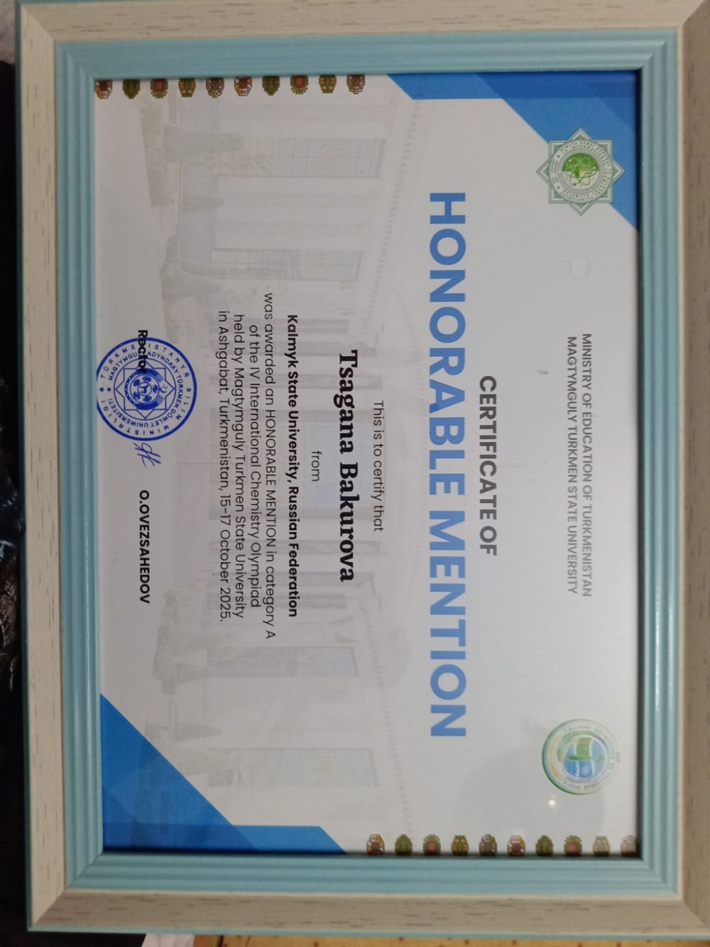 С 15 по 17 октября 2025 г. в Туркменском государственном университете имени Махтумкули проходила IV Международная олимпиада по химии, в которой приняли участие более 260 студентов высших учебных заведений Туркменистана, Российской Федерации, Китайской Народной Республики, Республики Казахстан, Исламской Республики Иран, Азербайджанской Республики, Республики Узбекистан, Республики Армения, Республики Таджикистан, Румынии и Республики Беларусь. Участники соревновались в личном зачёте в категориях А и Б.