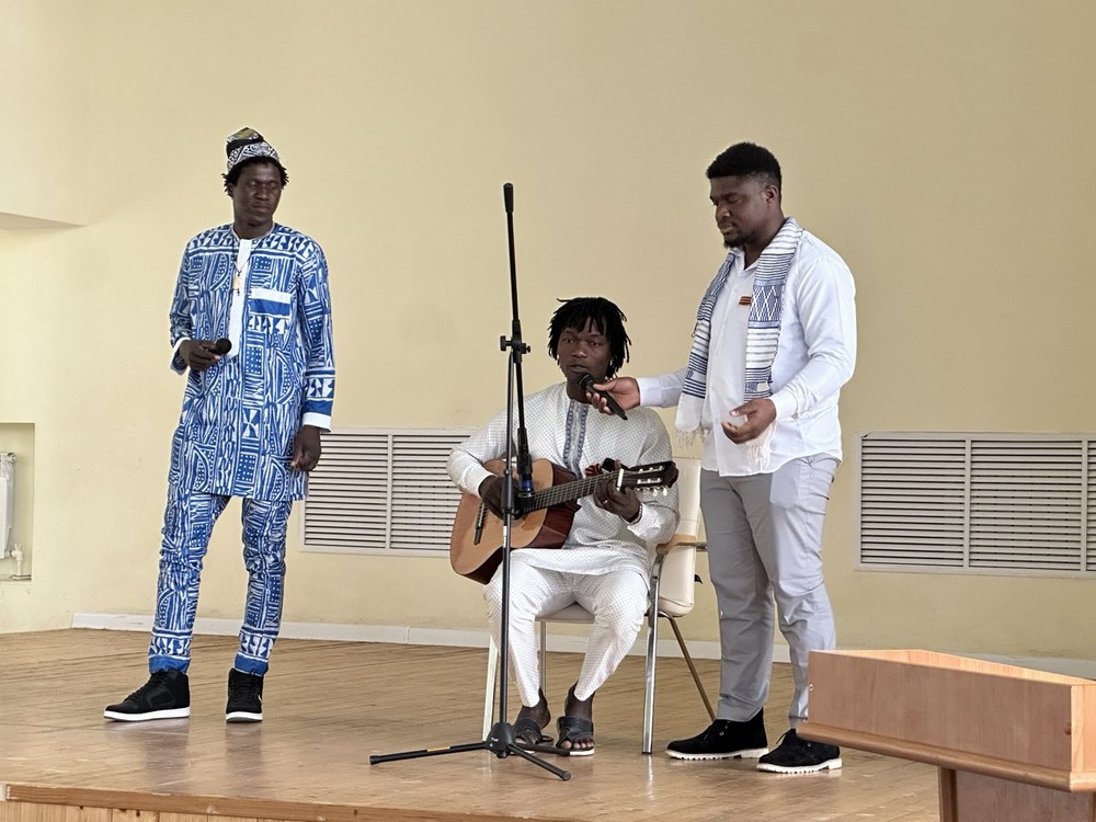 Все присутствующие услышали музыкальные произведения эпохи Великой Отечественной войны и послевоенного периода, песни о солдатском долге и чести. Одни из них звучат уже много лет. Другие появились сравнительно недавно. Но встреча началась с самой главной песни нашей страны, которая всегда вызывает гордость за Россию и ее мощь. Кристиан Каоба, студент 1 курса магистратуры факультета управления и права, и Седрик Томпте, студент 1 курса экономического факультета, исполнили гимн Российской Федерации.