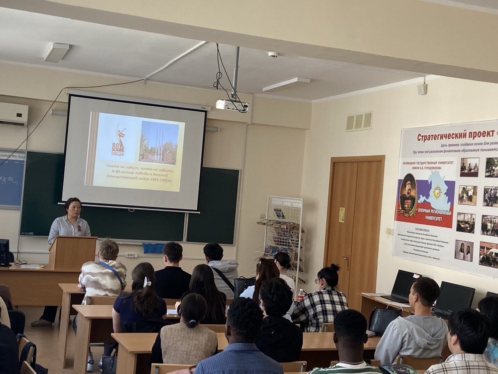 9 мая наша страна отмечает День Победы в Великой Отечественной войне. Праздник, который дорог каждому россиянину. Куратор группы рассказала о Героях Советского союза, уроженцев Республики Калмыкия, о их подвигах. В мероприятии приняла участие доцент кафедры экономической безопасности, учета и финансов Учурова Е.О., которая рассказала ребятам о трудовом подвиге советского народа, о доблести и отважности тружеников тыла, которые обеспечивали своим трудом победу Советского Союза над фашистской Германией.