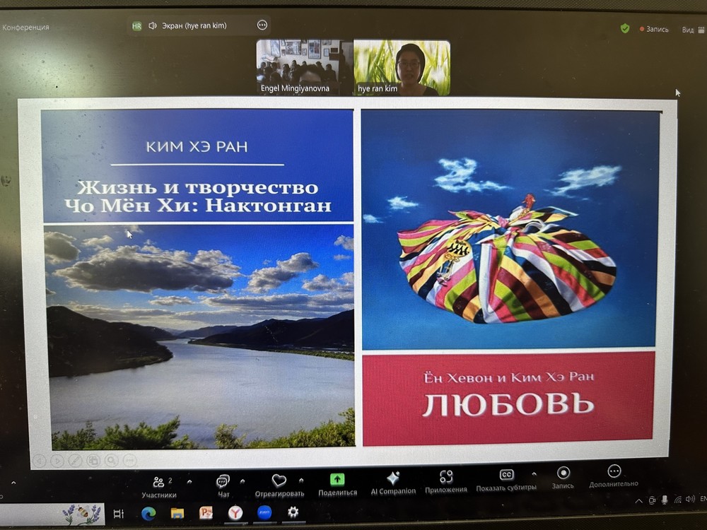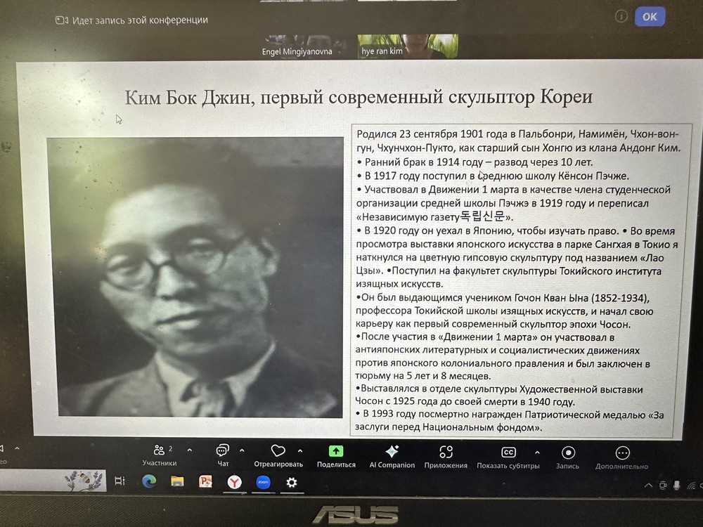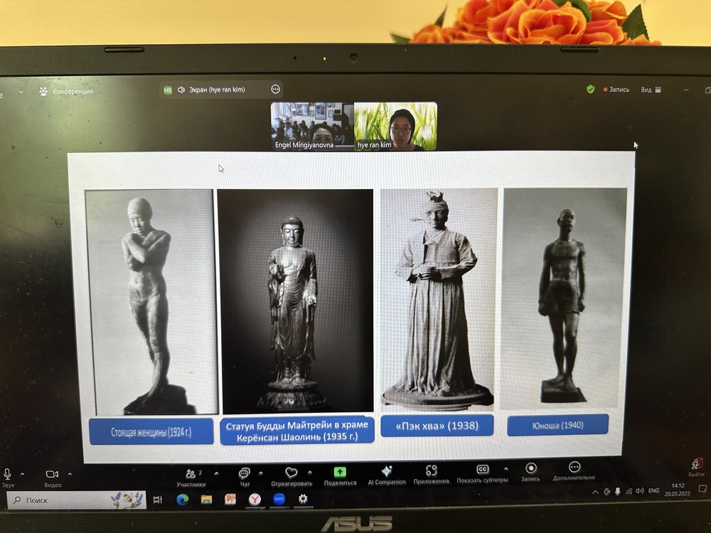 Сегодня в стенах Института калмыцкой филологии и востоковедения студенты смогли посетить онлайн-лекцию кандидата наук, доцента Школы востоковедения НИУ ВШЭ — Ким Хэ Ран, которую пригласила преподаватель кафедры калмыцкого языка, монголистики и алтаистики Мукабенова Жанна Алексеевна. Тема лекции — «Ким Бок Джин — первый современный скульптор Кореи».