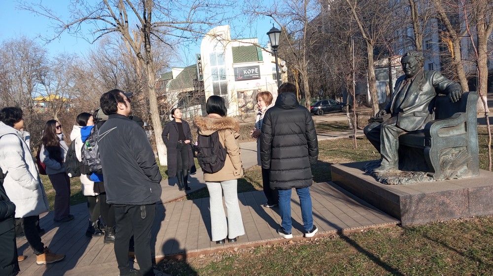 Далее вместе с библиотекарем и куратором О.Н. Болдыревой студенты прошли к памятнику народному поэту Давиду Кугультинову. Автор скульптуры – народный художник России Салават Щербаков. «Давид Кугультинов – та фигура, которая притягивала к себе, ведь он был великим человеком, большим во всех смыслах. Его творчество пронизано калмыцким духом», – сказала Лариса Бадышева.