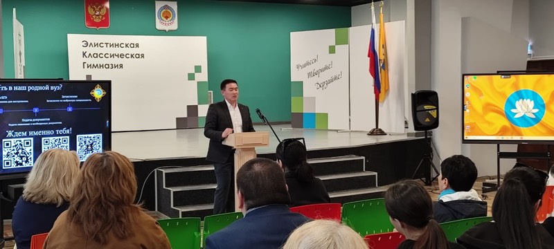 Проректор КалмГУ по молодежной политике и воспитательной работе М.В. Надбитов акцентировал внимание собравшихся на том, что учеба в родной республике, в Калмыцком государственном университете – это не только возможность получить качественное образование, но и, что очень важно сегодня, обеспечение безопасности наших детей. Мингиян Валерьевич призвал родителей и школьников выстраивать траекторию индивидуального образовательного маршрута, учитывая все аспекты и перспективы.
