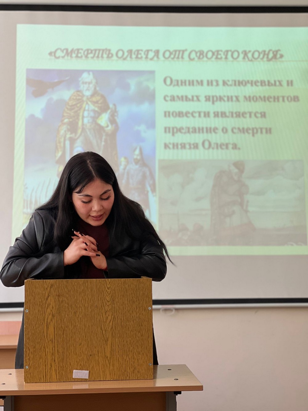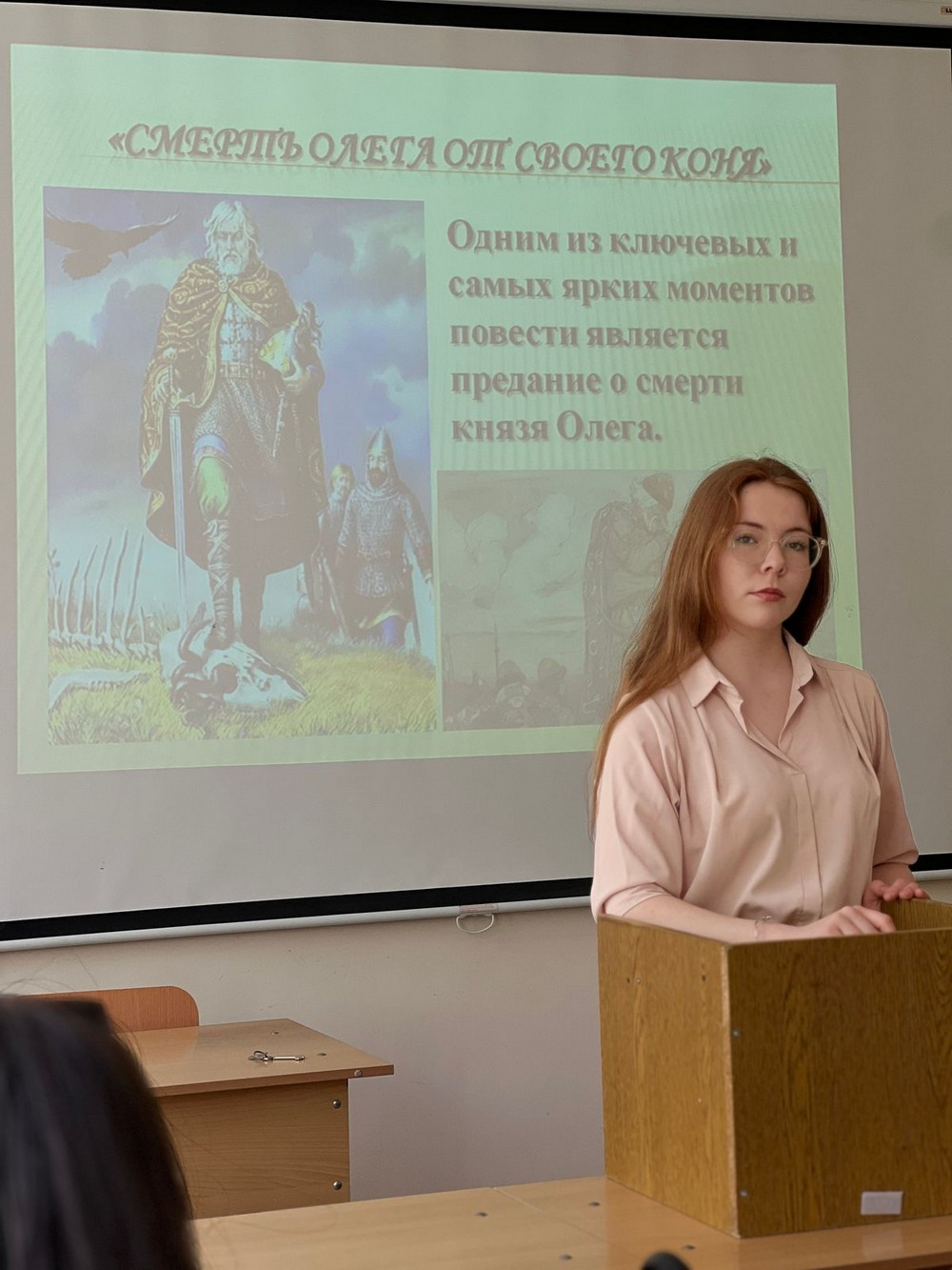 Далее «времен связующей нитью» стало проникновенное чтение студентами-филологами Шихановой С., Хамраевой С., Басхманджиевой В. и Муратбековой А. старославянского текста «Притча о блудном сыне» и отрывка из «Повести временных лет» — «Смерть Олега от своего коня», легшего в основу стихотворения А.С. Пушкина, основоположника русского литературного языка. — «Песнь о вещем Олеге», продекламированного студенткой Ксенией Очировой.