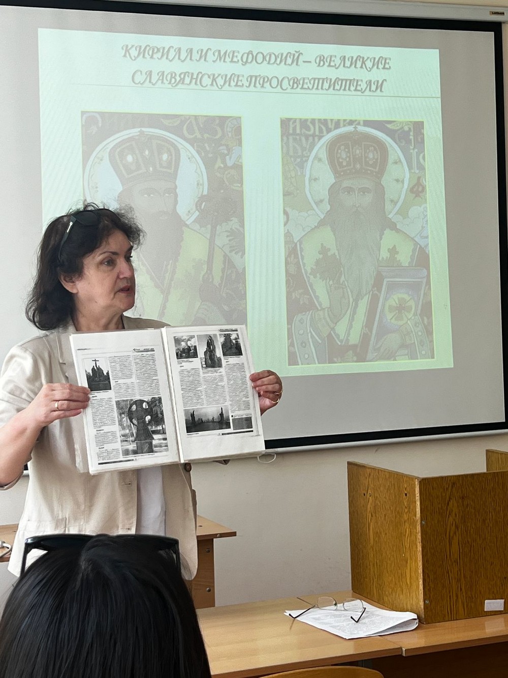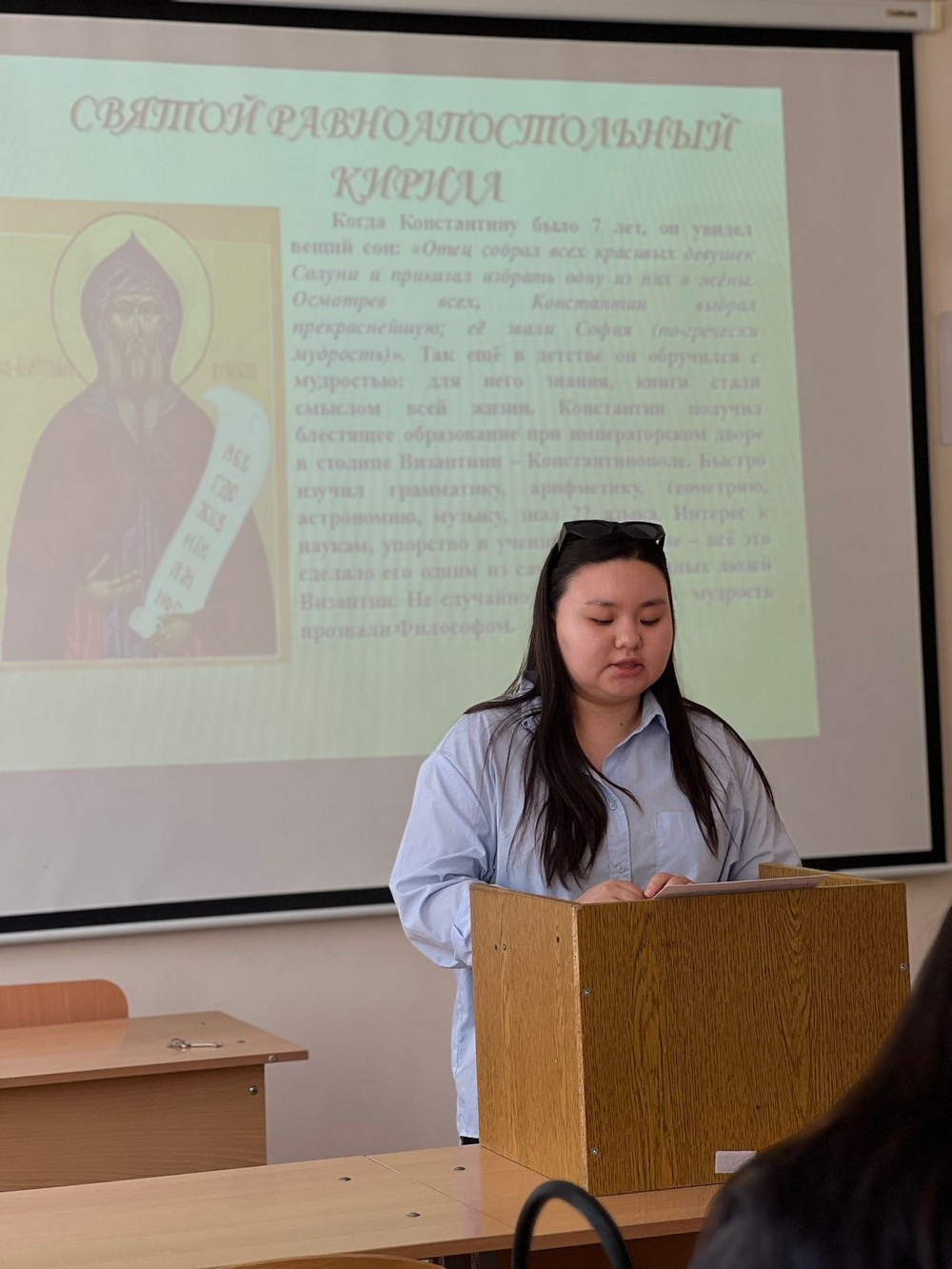 В начале мероприятия прозвучал «Гимн святым Кириллу и Мефодию», затем ведущая Елизавета Сязина рассказала нам об истории праздника, славянских первоучителях Кирилле и Мефодии, создавших азбуку не только для славян, но и для всего мира, т.к. кириллическая письменность сыграла исключительную роль в становлении светского образования и культуры самых разных народов; провела параллели между старославянским, древнерусским и современным русским языком, являющимся важнейшим фактором объединения людей самых разных национальностей.