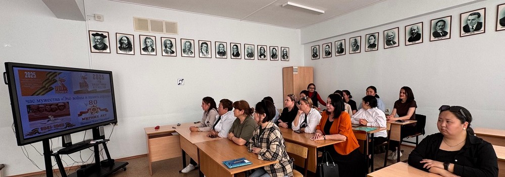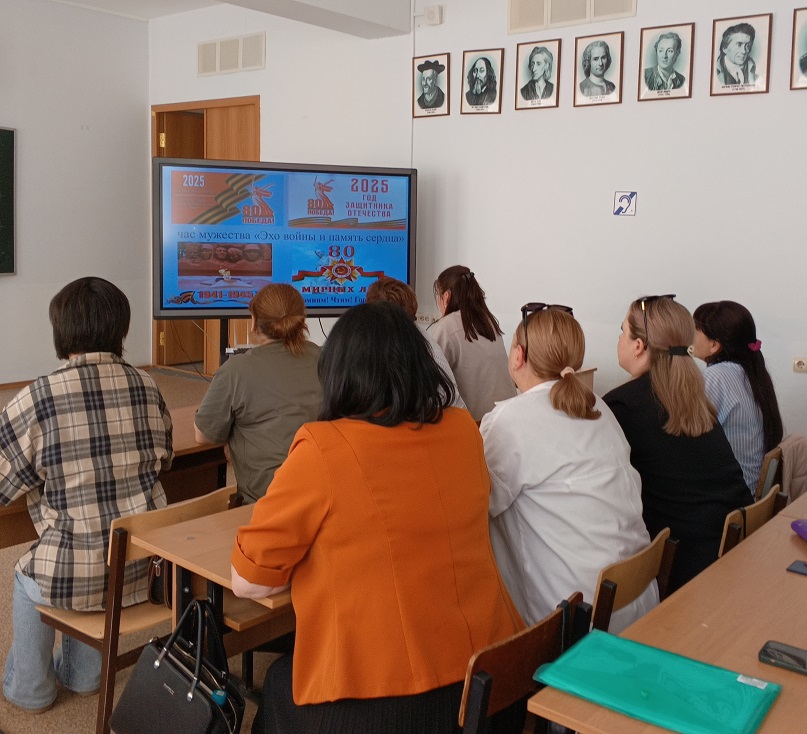 В преддверии памятного дня сотрудниками читального зала факультета педагогического образования научной библиотеки КалмГУ для студентов 3 и 4 курса профиля «Начальное образование» был проведен час мужества «Эхо войны и память сердца». Мероприятие началось с рассказа о событиях Великой Отечественной войны и героическом подвиге советского народа. Присутствующие приняли участие в интерактивной викторине «80 лет Великой Победе», которая включала в себя вопросы истории войны, биографиям героев, переломных битвах и т.д.