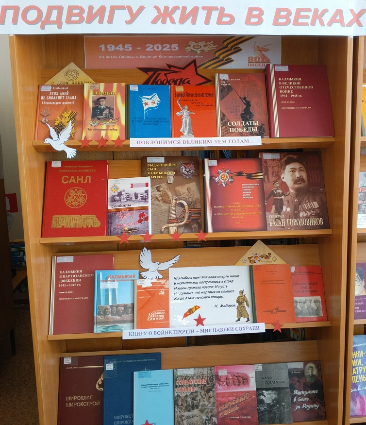 Ко дню Великой Победы сотрудники читального зала ФПО научной библиотеки КалмГУ подготовили для своих читателей книжную выставку «Подвигу жить в веках!», на которой представлены известные произведения о Великой Отечественной войне, которые являются своеобразным литературным памятником тем, кто не дожил до Великой Победы, но сделал все, чтобы приблизить ее. Проходят годы, сменяются поколения, но День Великой Победы остается самым священным и значимым праздником нашей Отчизны!