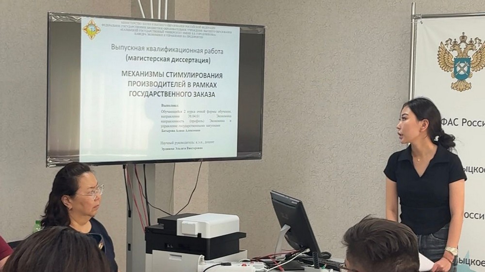 На предзащите присутствовали декан экономического факультета Павлова Н.Ц., завкафедрой экономики и управления на предприятии Батырева Д.Б., доценты кафедры экономики и управления на предприятии Эрдниева Э.В., Хартылова Д.Б., Намысов С.В. От УФАС по РК в качестве экспертов выступили руководитель организации Ностаева Наталья Вячеславовна, а также государственные инспекторы Соломко Евгений Юрьевич и Басангова Амрхи Валерьевна.