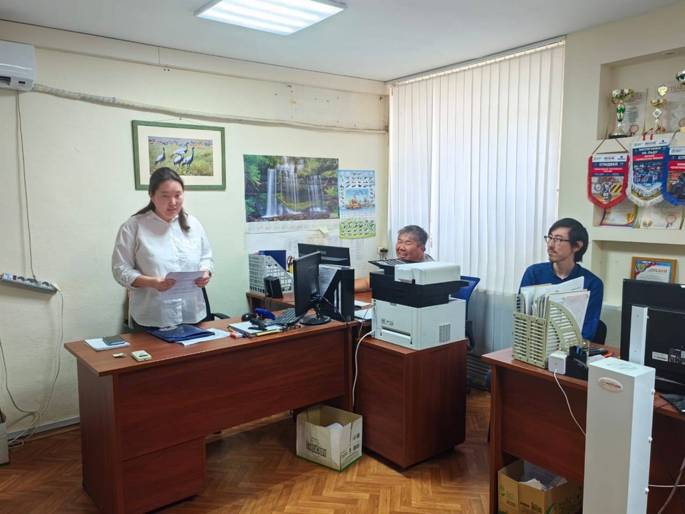На предзащите, которая состоялась 10 июня, были представлены актуальные исследования в области экологии и охраны животного мира. В качестве внешних экспертов мероприятие посетили начальник отдела Боваев В. Д. и ведущие специалисты отдела: Кравчук О. А., Эрднеев Э. А., Улюмжуев Н. М. и Арилов Д. М.