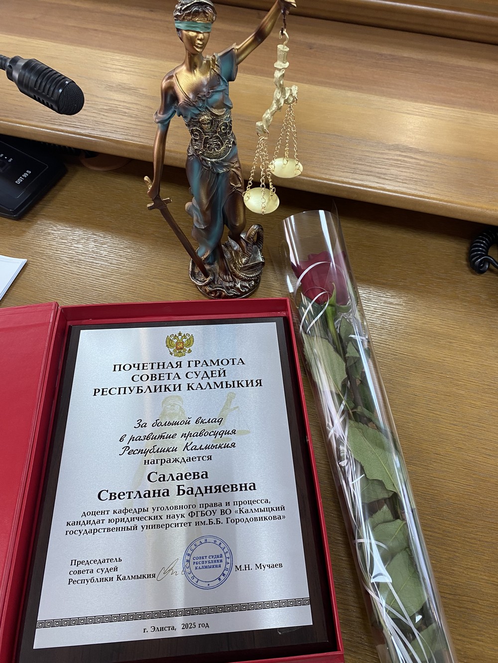 Сегодня на заседании Квалификационной коллегии судей Республики Калмыкия состоялось торжественное награждение доцента кафедры уголовного права и процесса Салаевой Светланы Бадняевны.