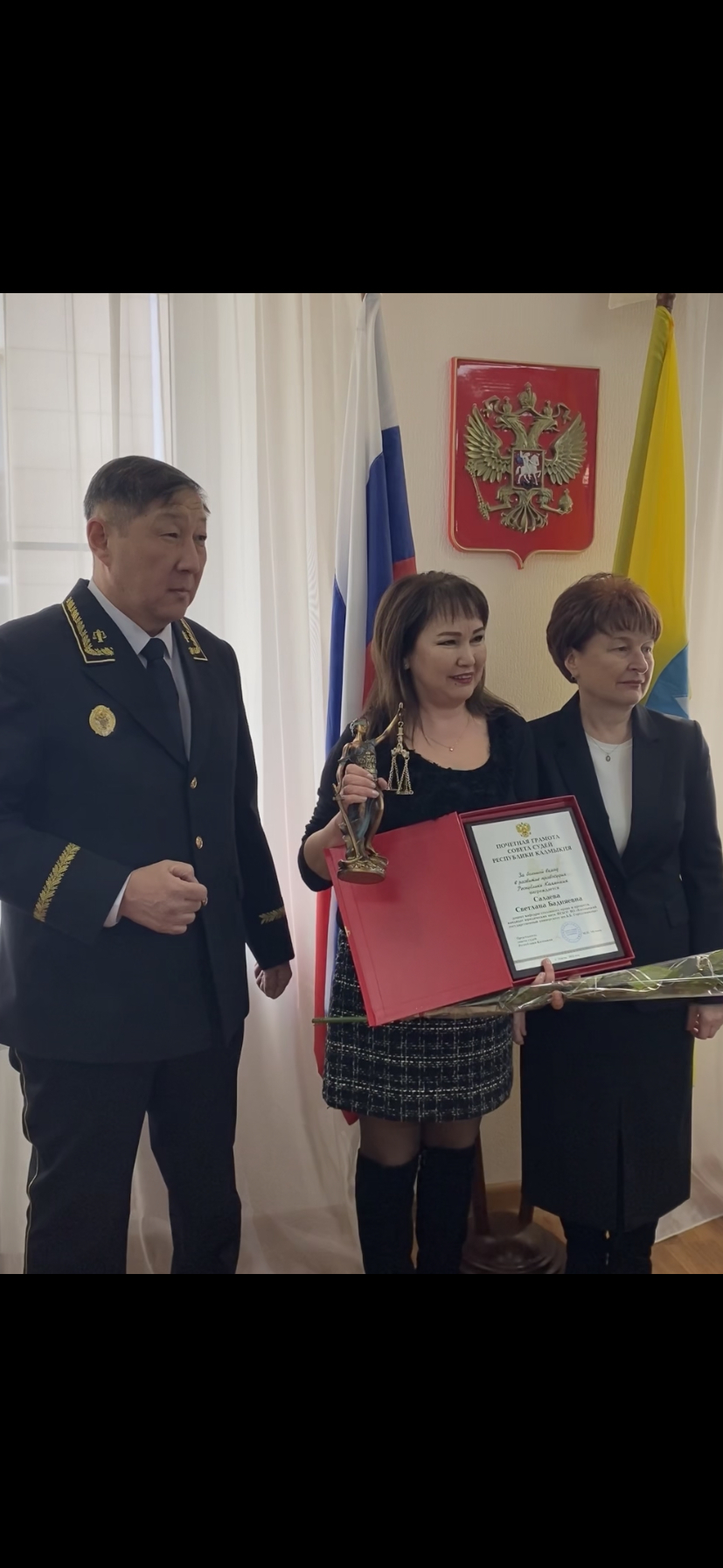 Председатель Квалификационной коллегии судей РК Андреев Эрдни Гахаевич и председатель судебной коллегии Верховного суда РК Коченкова Лариса Дмитриевна вручили Светлане Бадняевне Почетную грамоту Совета судей РК за большой вклад в развитие правосудия Республики Калмыкия.