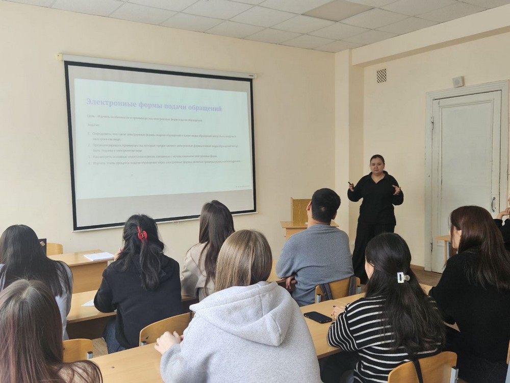 В ходе занятия студенты раскрыли актуальные вопросы и практические аспекты работы с электронными обращениями граждан, а также подчеркнули важность цифровизации в сфере документооборота. Также разобрали примеры успешного применения электронных форм в государственных учреждениях.