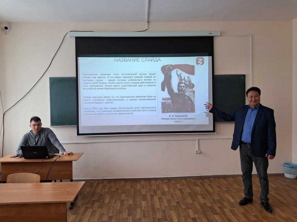С 5 марта по 19 марта 2025 года в рамках воспитательной работы гуманитарного факультета и совместно с Российским обществом «Знание» преподаватели Калмыцкого государственного университета им. Б.Б. Городовикова провели серию образовательных мероприятий, посвященных партизанскому движению в годы Великой Отечественной войны. Мероприятия проведены в рамках празднования 80-летия Победы в Великой Отечественной войне 1941-1945 годов.
