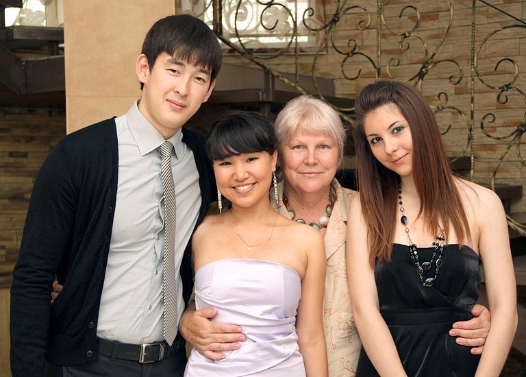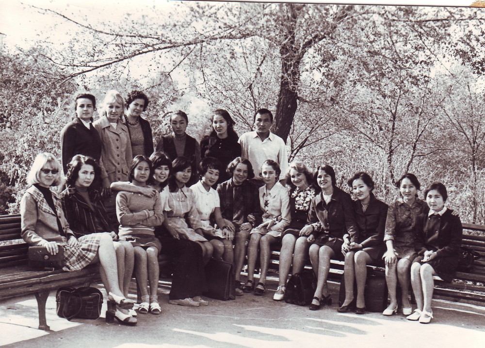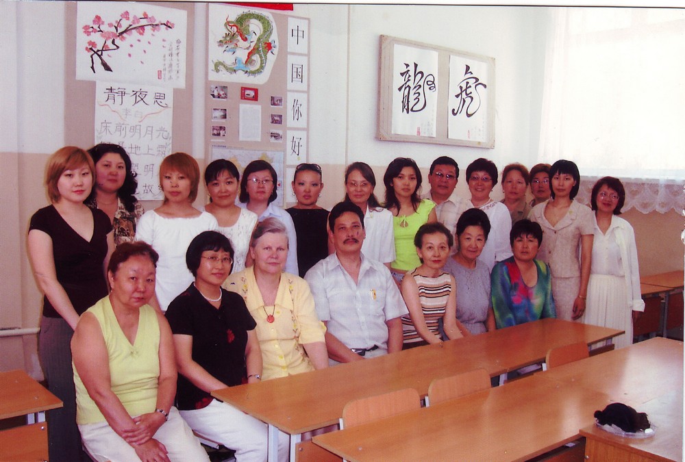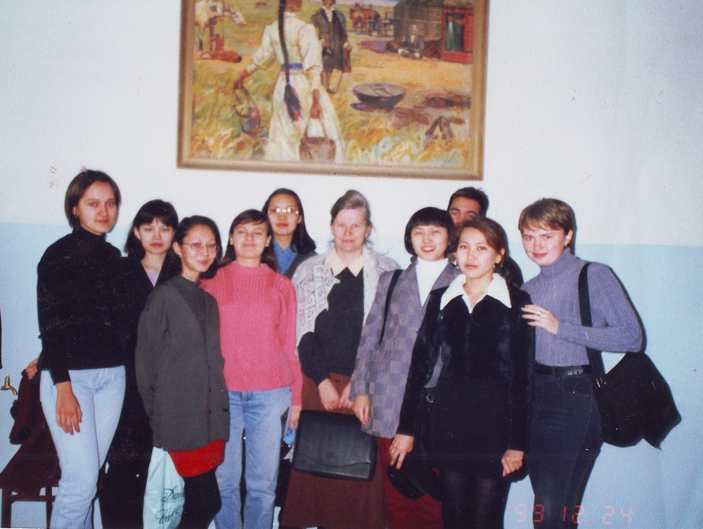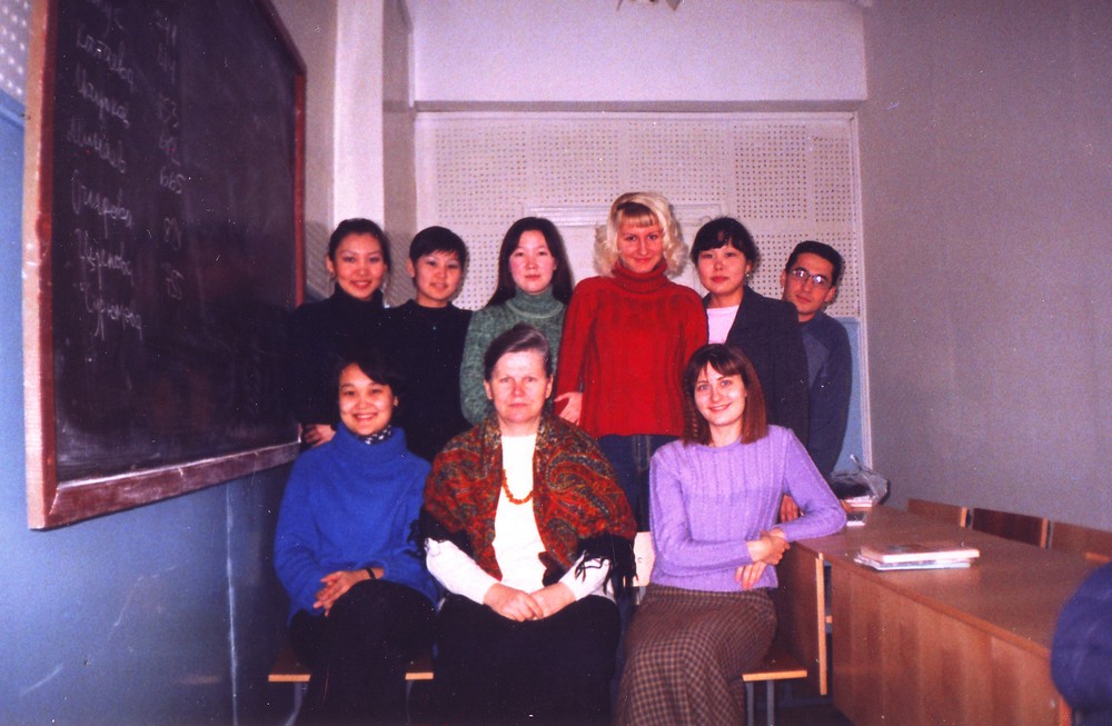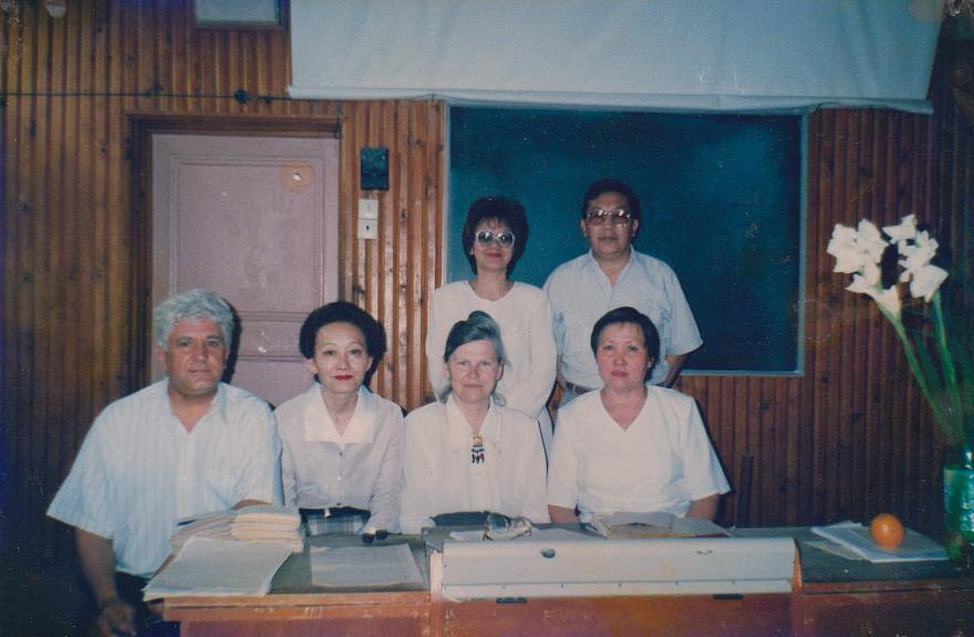 Фото 7. 1997 г. Преподаватели немецкого языка с деканом факультета на выпускном экзамене. Первый ряд, стоят: 1-ая Каминова Ольга Монголовна, старший преподаватель кафедры иностранных языков, 2-ой Чунгунов Борис Церенович, кандидат филологических наук, доцент. Второй ряд, сидят: 1-ый Колодько Василий Иванович, декан, 2-ая Бораева Вера Борисовна, старший преподаватель, 3-ая Микитенко Елена Ивановна, кандидат филологических наук, доцент, 4-ая Самтонова Елизавета Борисовна, ассистент кафедры иностранных языков.