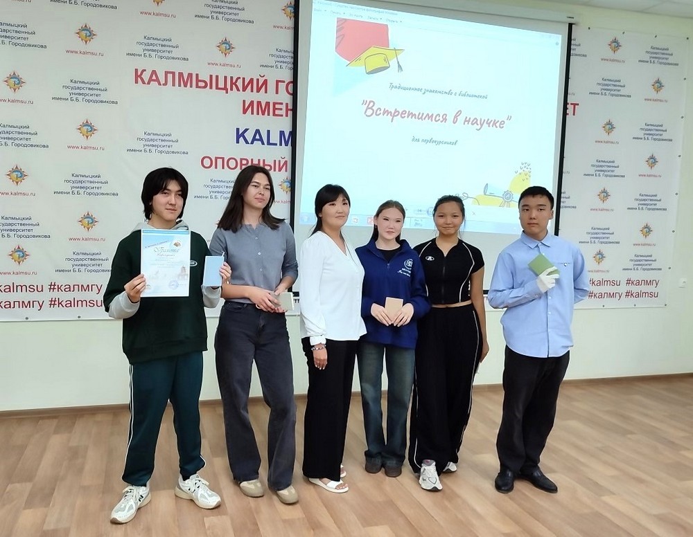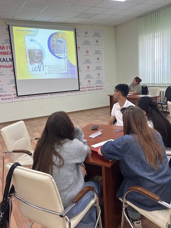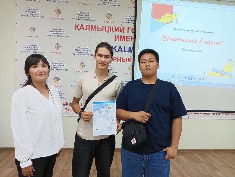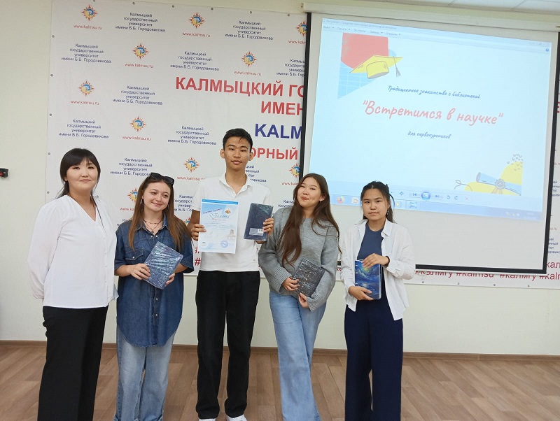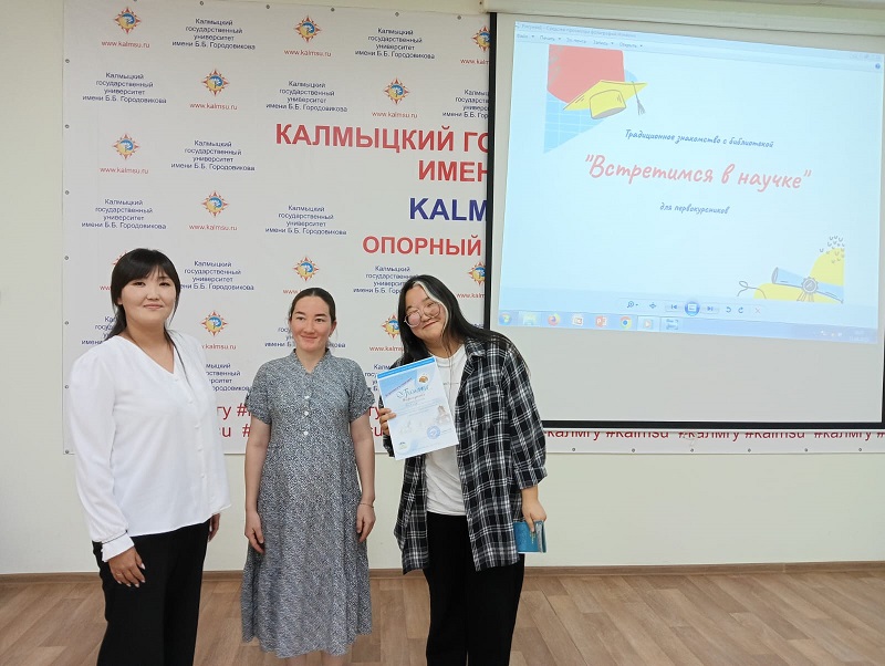 Познакомили ребят с краткой историей библиотеки, которая старше самого университета. Нам было важно показать ребятам, что библиотека – не только место для обеспечения их учебной литературой, а еще и место творческой среды в университете, где можно проявить свои организаторские, певческие и другие таланты, о чем они узнали из красочной презентации, подготовленной Е.В. Басанговой, заведующей отделом цифровых технологий и сервисов. Пожелав первокурсникам успешной учебы, об электронных возможностях и услугах библиотеки рассказала зав. информационным отделом Л.В. Панагасова. Конечно, просто комментировать слайды – скукотище! Это не про нас! Поэтому мы подготовили для ребят интеллектуальную игру из трех раундов: «Словесный портрет», «Чей совет» и «Ассорти». В первом они узнавали литературных героев по описанию их внешности, странно, но не всем удалось вспомнить Плюшкина, зато дядю Федора, Гарри Поттера и других узнали. Во втором вспоминали жизненные советы Воланда, Винни-Пуха, Маленького принца, не буду перечислять всех, а в третьем, вспомните название – ассорти, звучали имена родоначальника жанра басни в калмыцкой литературе, Зая-Пандита, авторов государственных символов республики. Только одна команда назвала «Три рисунка» А. Балакаева, но когда на экране высветился правильный ответ, почти у всех взметнулись руки в характерном жесте ко лбу: «а-а, да!». Тоже случилось и с вопросом об эзоповом языке. Были слышны их рассуждения о профессии, когда-то исключительно мужской, которой более 4-х с половиной тысяч лет, и чтобы попасть на эту службу, требовалось высшее образование, знание нескольких языков. Надо сказать, что мы составляем вопросы всегда с подсказкой в формулировке, наша цель – не проверить их знания, на это есть преподаватели, мы скорее прививаем навыки их творческого применения. Но вот фамилии Н. Лобачевского, братьев Гримм, К. Чуковского и И. Крылова, работавших когда-то библиотекарями, не помогли ребятам. Пришлось рассказать им о том, что И.А. Крылов считается родоначальником использования библиотечных шифров, связывающих книги и каталог. Он называл шифр «приметой книги».