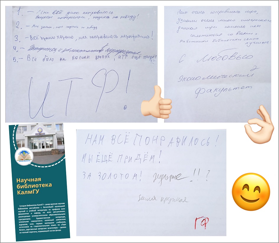 Итоги игры объявила зам. директора библиотеки Е.Н. Лиджиева, вручив победителям грамоты и небольшие, но полезные призы. Грамоты получили и все другие команды за участие, т.к. это была праздничная игра-знакомство. Кроме того каждому участнику были вручены, подготовленные Е.В. Басанговой, зав. отделом цифровых технологий и сервисов, красочные путеводители по научной библиотеке, абонементы которой расположены в разных корпусах университета. Но не это главное! Главное – полученные положительные эмоции, что ребятам, пишут, понравилось, смотрите фото. Мы тоже рады знакомству! Спасибо всем за участие! Выражаем благодарность заместителям деканов по воспитательной работе за сотрудничество. Отдельная благодарность Надежде Акимовне Акименко (ГФ), в тот же вечер написавшей нам, что «ребята остались довольны». Обратная связь всегда приятна, особенно учитывая, что в «Законе об образовании в РФ» воспитательная работа в вузах указана неотъемлемой частью образовательного процесса. А библиотека, являясь источником обеспечения необходимой информацией учебного и научного процессов в университете, оказывает содействие и его воспитательным программам. Любое мероприятие, а интеллектуальные игры особенно, это всегда большая предварительная работа, поэтому хочется активного участия студентов всех факультетов, все для них.