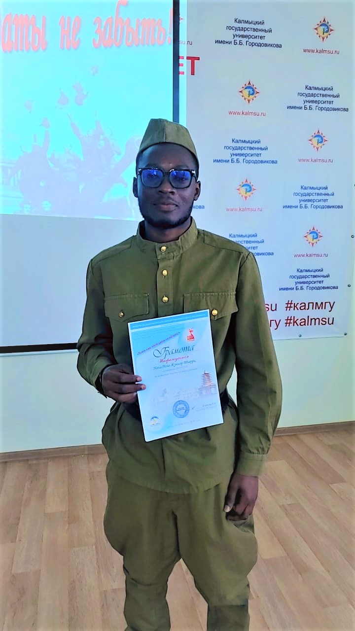Уэдраого Балкисса: «Мне понравилось, что нам выдали военные костюмы. Таким образом, мы могли еще больше прочувствовать атмосферу этого праздника. Я рада, что мне удалось рассказать стихотворение на калмыцком языке, но, поверьте мне, это было совсем нелегко».