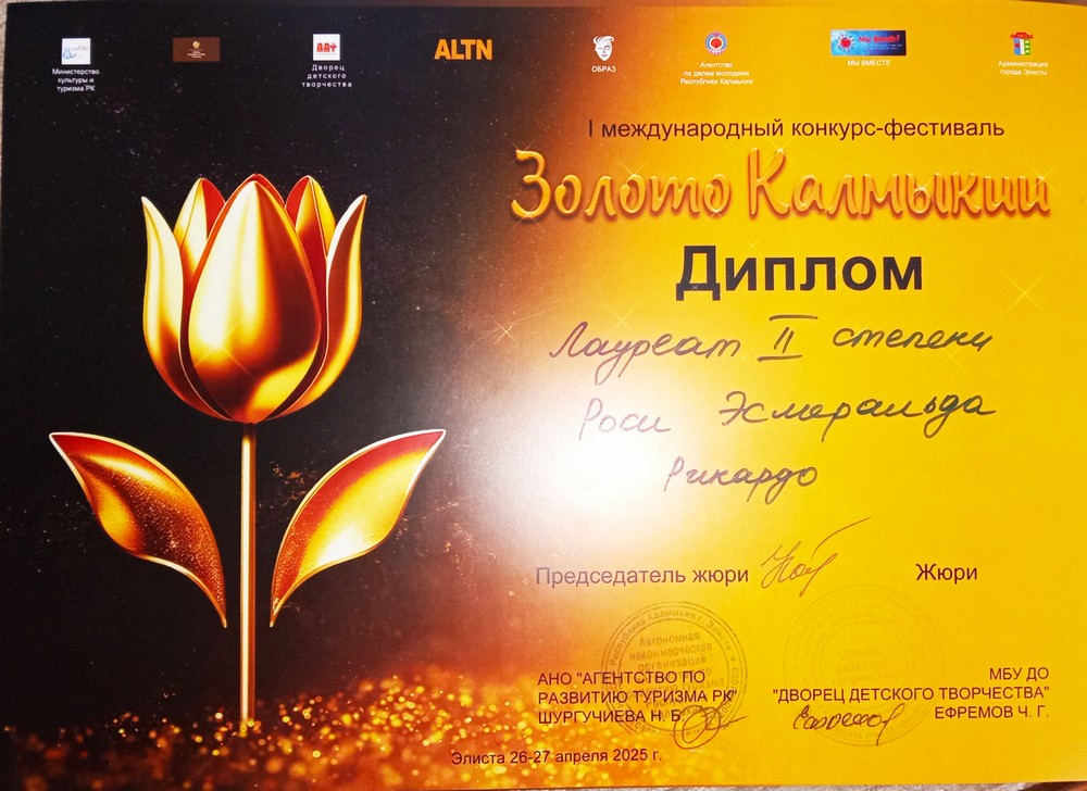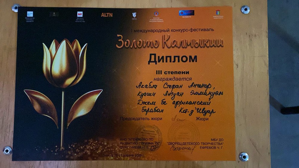 По итогам конкурса «Золото Калмыкии» Росио Эсмеральда Рикардо Майедо стала лауреатом II степени и была награждена кубком и дипломом, а Акабла Стефан Ангенор с Куаши Антуаном Эммануэлем получили диплом III степени.
