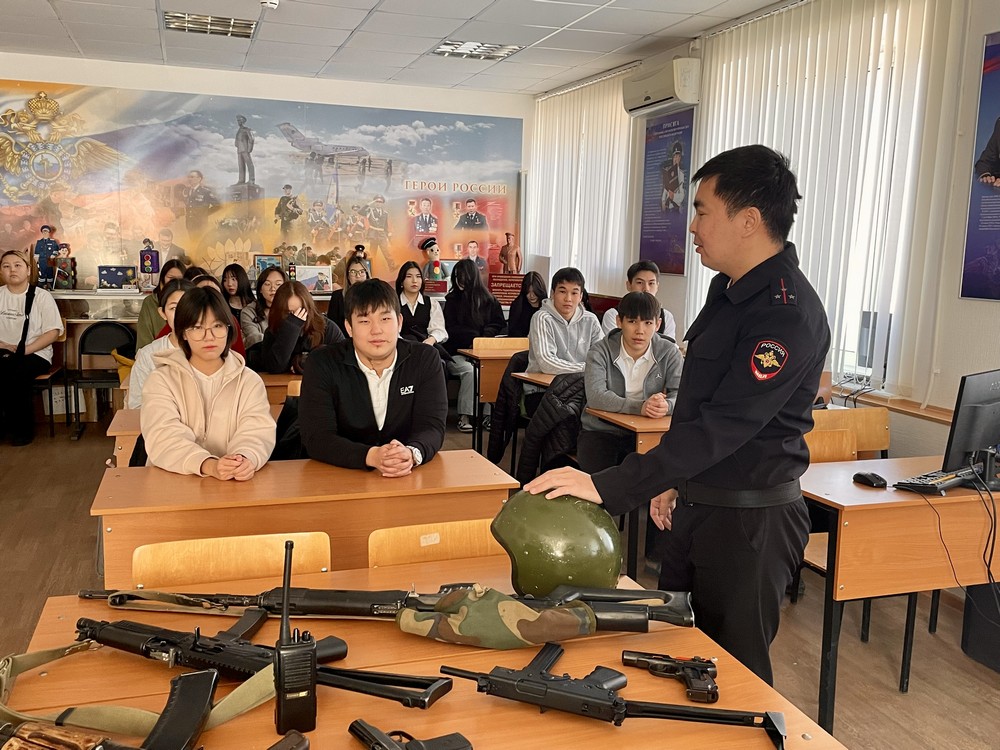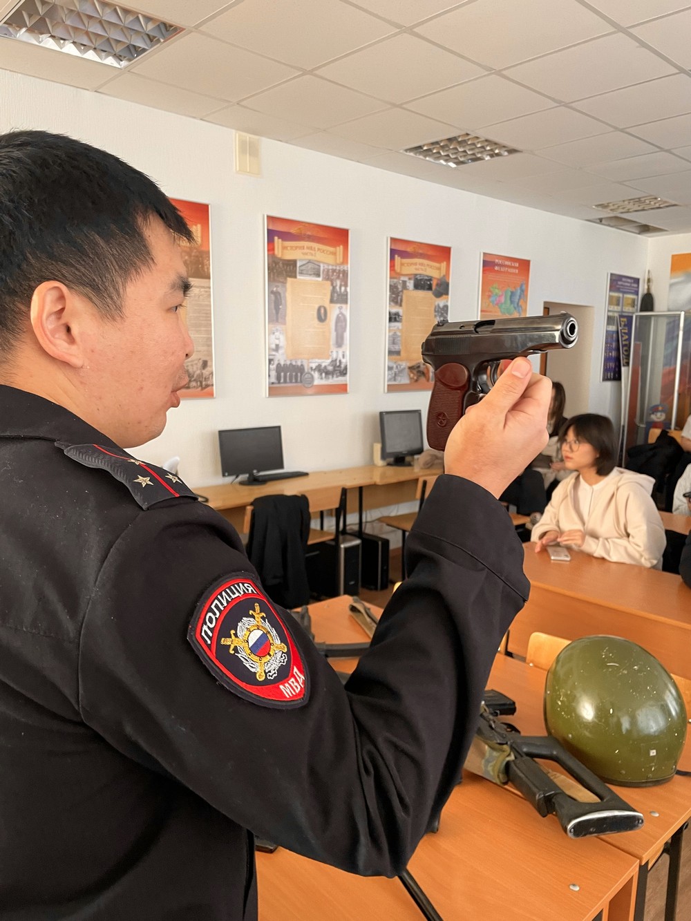 В рамках экскурсии ребята также посетили музей МВД, где узнали об истории министерства и его символике. Далее экскурсия привела их в класс служебной подготовки, где старший инспектор отдела профессиональной подготовки, старший лейтенант полиции Манджиев Дорджи продемонстрировал образцы учебного оружия. Перед демонстрацией слушатели Школы прошли инструктаж по технике безопасности и правилам обращения с оружием. Им были показаны различные виды огнестрельного оружия, включая автомат Калашникова, пистолет Макарова и снайперскую винтовку.