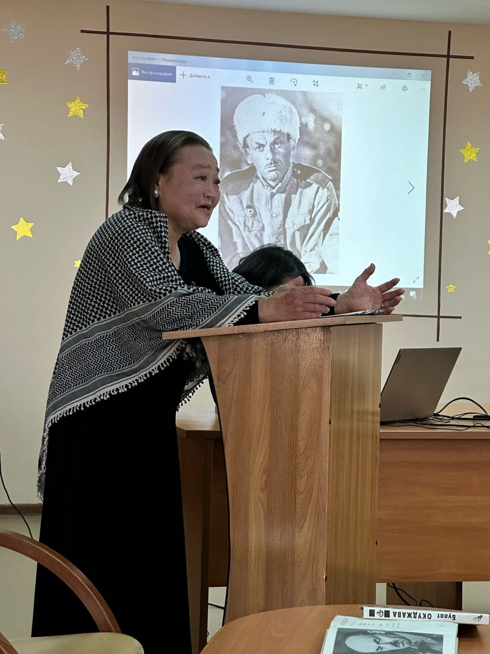 Так, Зоя Ивановна рассказала студентам о калмыцком следе в жизни Окуджавы и прочитала отрывок из книги журналиста Лилии Щегловой «Твои люди, Калмыкия, – помним, гордимся!»: «…Как выяснилось, Булат Окуджава молоденьким солдатиком воевал где-то под Хулхутой. В тех местах он и попросил остановить машину. Вышел и пошел один в сторону от дороги, в степь. Все сидели и молча смотрели ему вслед. Вскоре его худощавая фигура скрылась из виду. Через какое-то время он вернулся, и мы поехали дальше. Что делал он там, в степи, какие мысли рождались в его голове при виде уже обожженной солнцем, голой степи, кто знает…».
