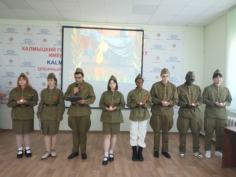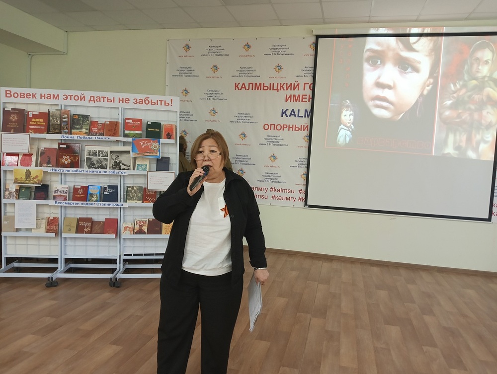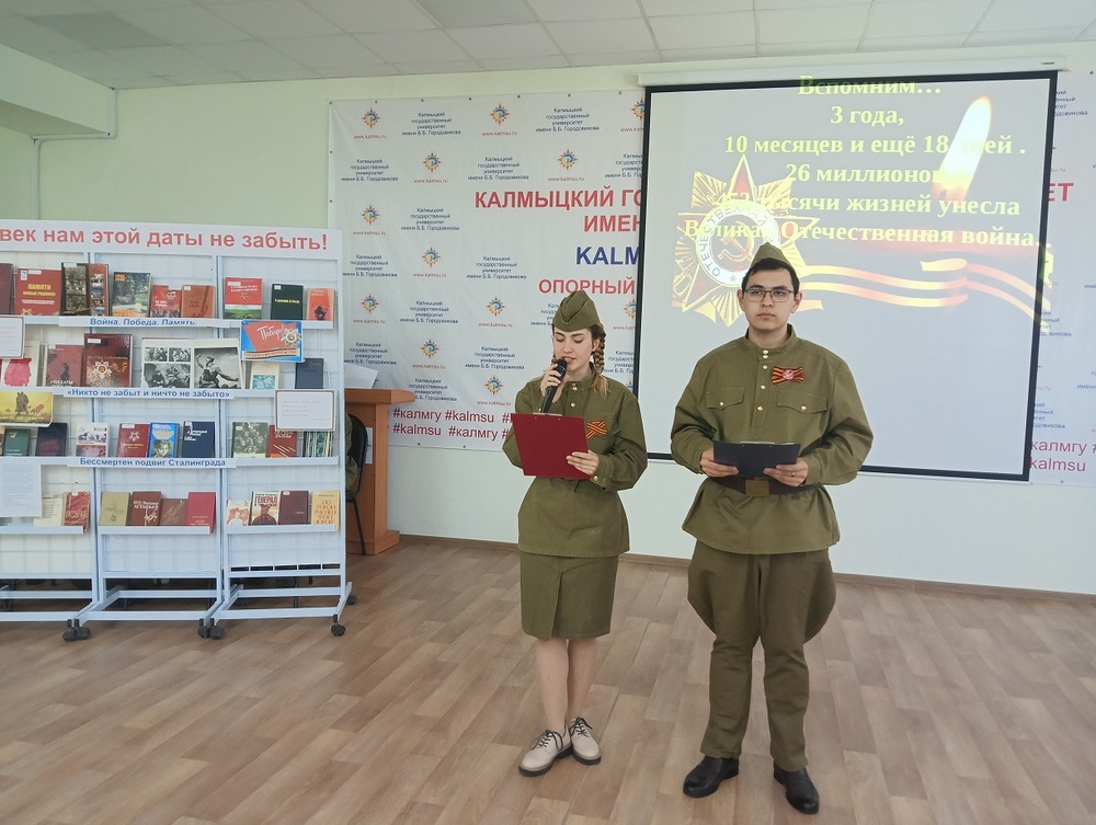 В преддверии главного праздника нашей страны – 80-й годовщины со дня Победы в Великой Отечественной войне, в научной библиотеке КалмГУ состоялась литературно-музыкальная гостиная «Вовек нам этой даты не забыть!» В основу праздника была положена музыкально-поэтическая композиция, которую представили студенты и сотрудники КалмГУ.