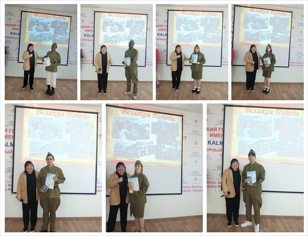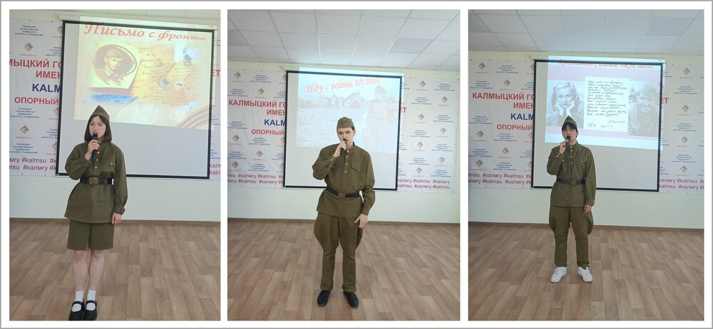 В исполнении студентов: 1 курса ФУП, направления «СПД-1» Убуша Яшкулова, 1 курса ГФ, направления «Отечественная филология» Лукьянченко Алины и Евкиной Дарьи, 2 курса, направления «История» Гермалеева Евгения, прозвучали стихи: К. Симонова «Жди меня», А. Дементьева «Письмо с фронта», Ю. Соловьева «Иду с войны, иду домой», Е. Евтушенко «Хотят ли русские войны?..».