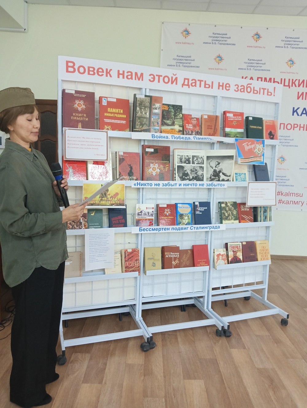 Традиционным дополнением к встрече стала книжная выставка «Вовек нам этой даты не забыть!», представленная рубриками: «Война. Победа. Память», «Никто не забыт, ничто не забыто», «Бессмертен подвиг Сталинграда», рассказывающая о событиях 1941 – 1945 годов, о великих битвах и сражениях. С библиографическим обзором выступила ведущий библиотекарь научной библиотеки КалмГУ Михайлова Н.Н.