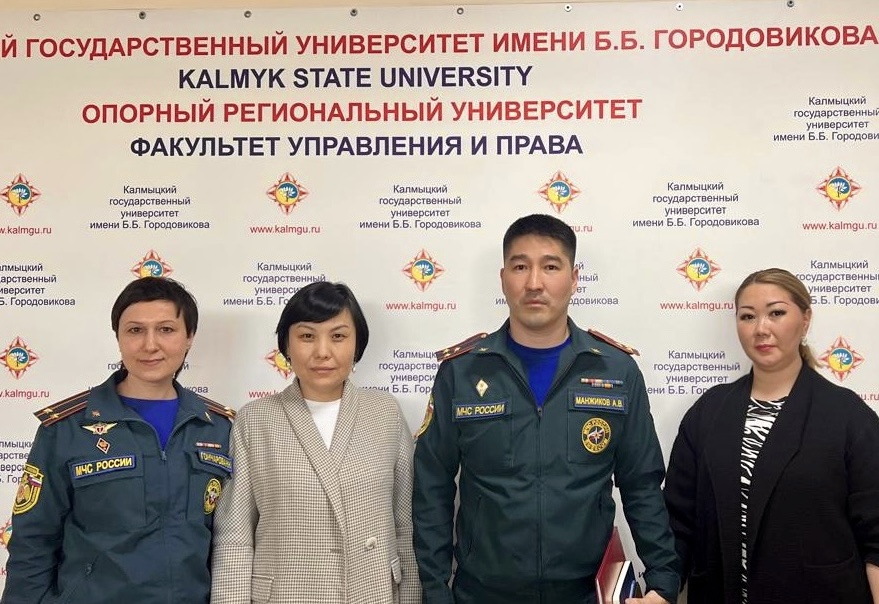 На факультете управления и права прошла встреча со студентами факультета управления и права и инженерного технологического факультета, в которой приняли участие сотрудники Главного управления МЧС России по Республике Калмыкия — подполковник внутренней службы, начальник отдела кадров, воспитательной работы и профессионального обучения ГУ МЧС России по РК Гончарова Наталья Николаевна и полковник внутренней службы, заместитель начальника ГУ МЧС России по РК, начальник управления надзорной деятельности и профилактической работы Манжиков Александр Владимирович.