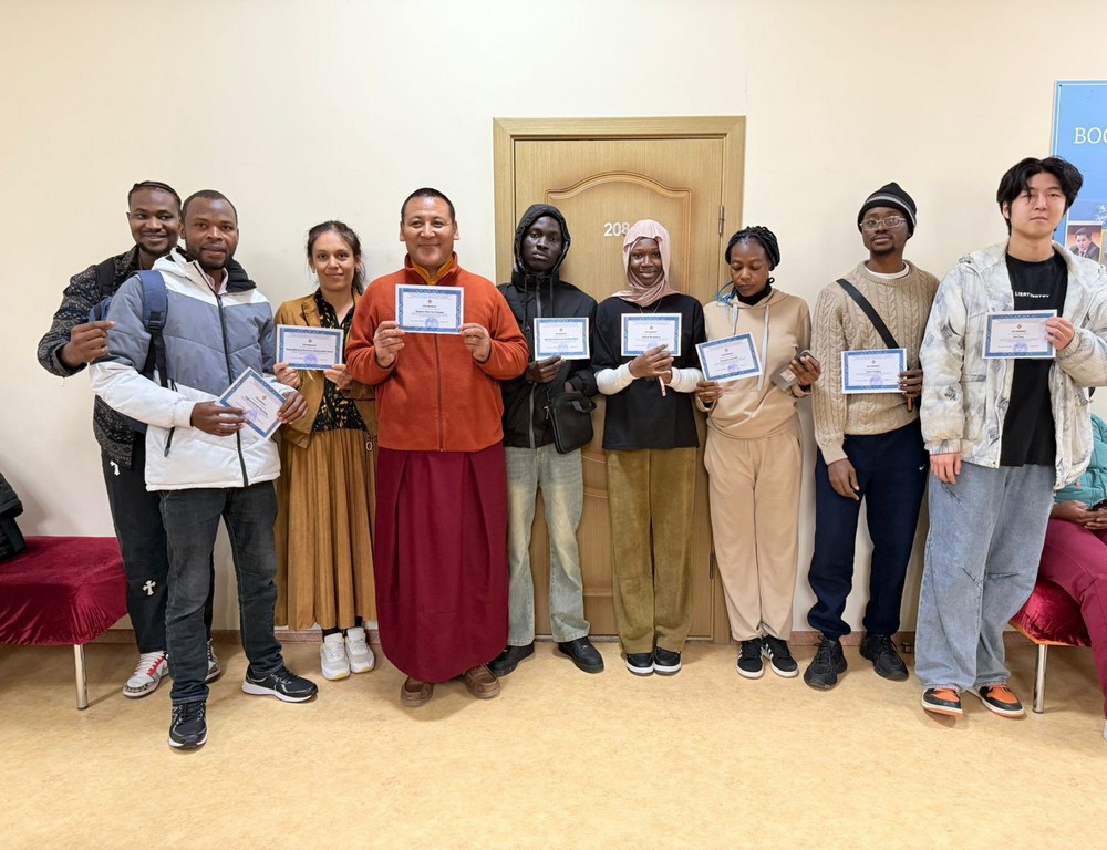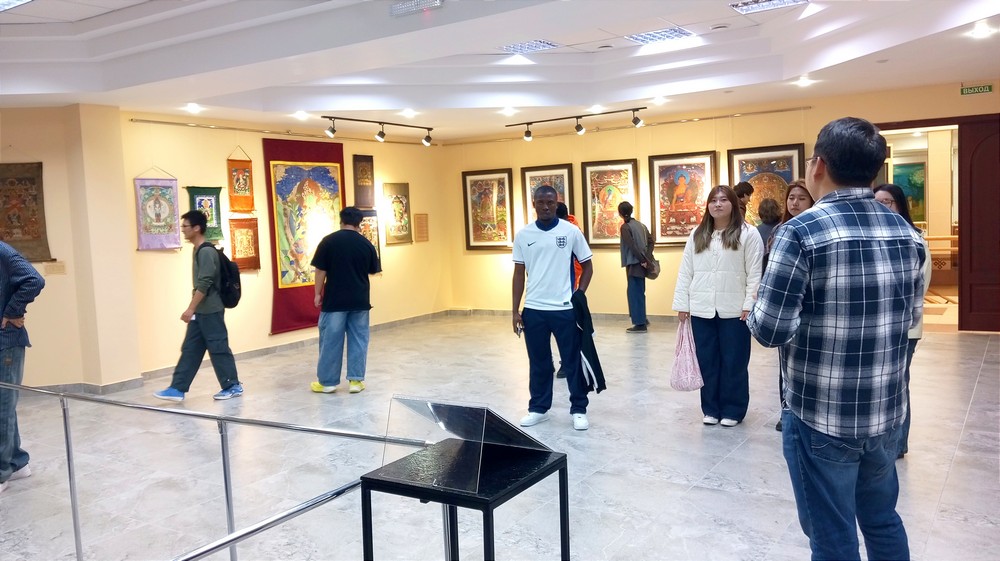 Далее иностранцы перешли к выставке «Буддийское искусство», которая включает в себя 165 произведений конца XVIII – начала XX века. Экспозиция, сформированная на основе коллекций Национального музея Калмыкии, представлена калмыцкими иконами — дарцигами (тиб. «танка»), буддийской скульптурой и разнообразными культовыми предметами. Музейная коллекция памятников буддийского культа формировалась в середине ХХ века. В одном зале Национального музея Калмыкии собраны такие экспонаты, которые считаются драгоценными реликвиями калмыцкого народа.