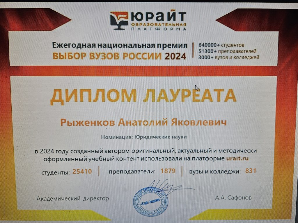 Факультет управления и права сердечно поздравляет профессора кафедры гражданского права и процесса Рыженкова Анатолия Яковлевича с получением Ежегодной национальной премией...