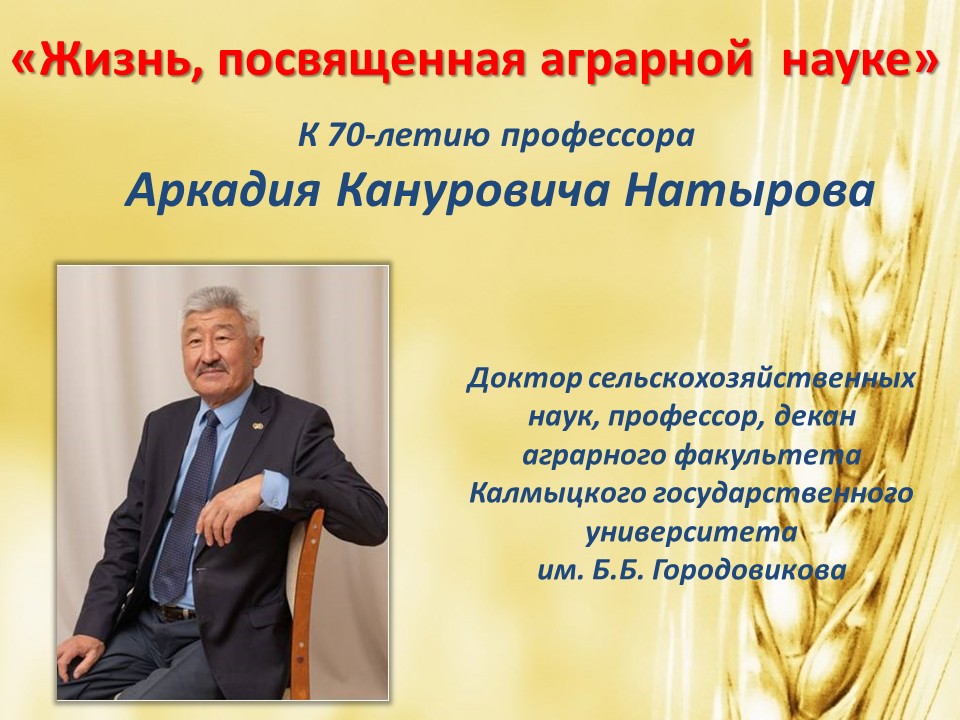 22 октября доктор сельскохозяйственных наук, профессор, декан аграрного факультета КалмГУ Аркадий Канурович Натыров отмечает свой 70-летний юбилей. А.К. Натыров родился...