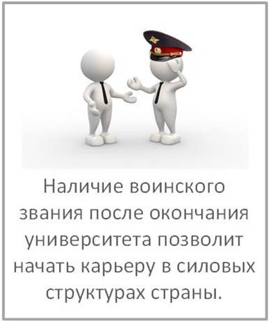 Студентам, которые успешно завершат обучение в рамках системы военной подготовки, после окончания университета будет присвоено воинское звание в соответствии с освоенной программой военной подготовки с одновременным зачислением в запас Вооруженных Сил Российской Федерации.
