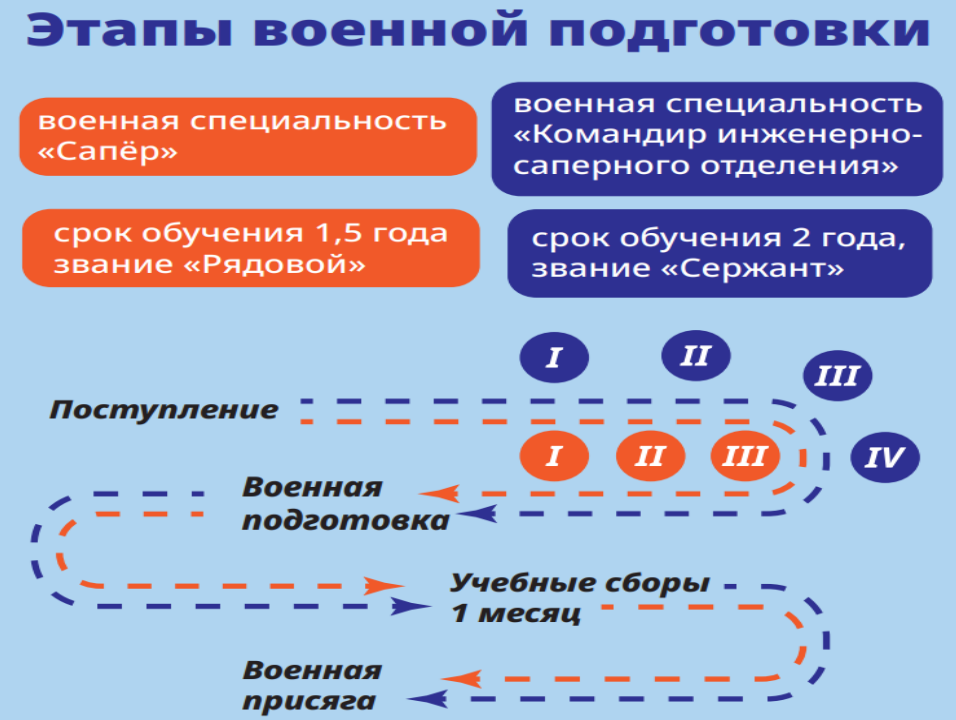 Военная подготовка ведется по двум военно-учетным специальностям Инженерных войск Вооруженных Сил Российской Федерации: